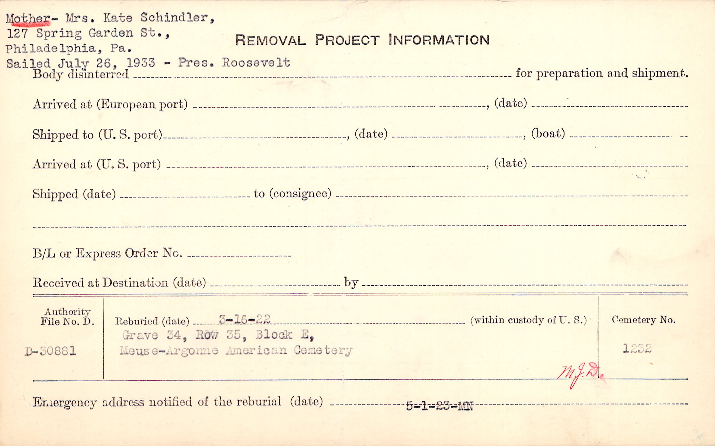 Mother- Mrs. Kate Schindler, 127 Spring Garden St., Philadelphia, Pa. Sailed July 26, 1933 - Pres. Roosevelt |