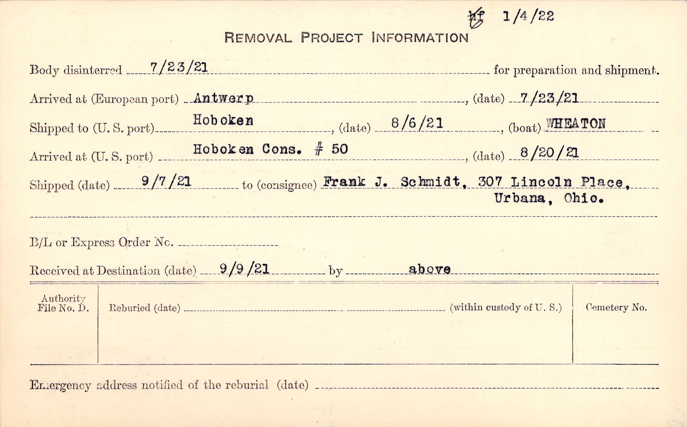 to Frank J. Schmidt, 307 Lincoln Place, Urbana, Ohio.