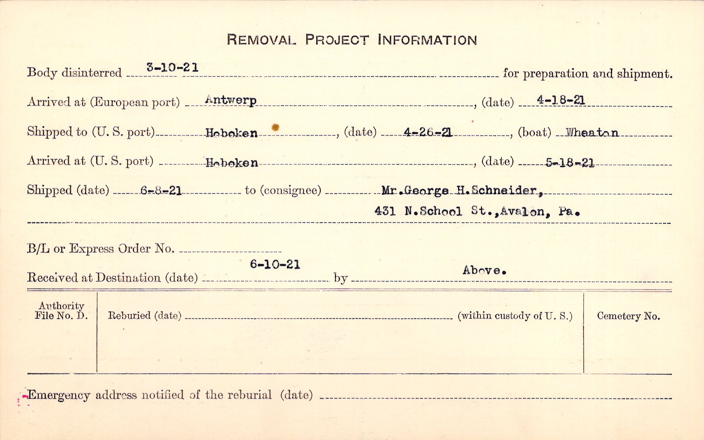 Body disinterred 3/10/1921 for preparation and shipment.