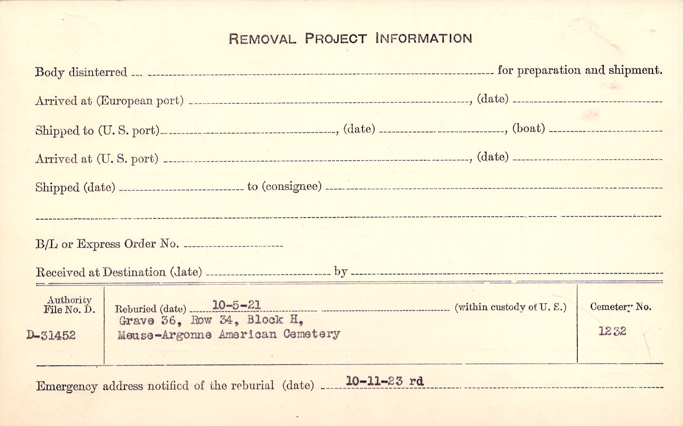 | Permanent Burial in Foreign Cemetery |