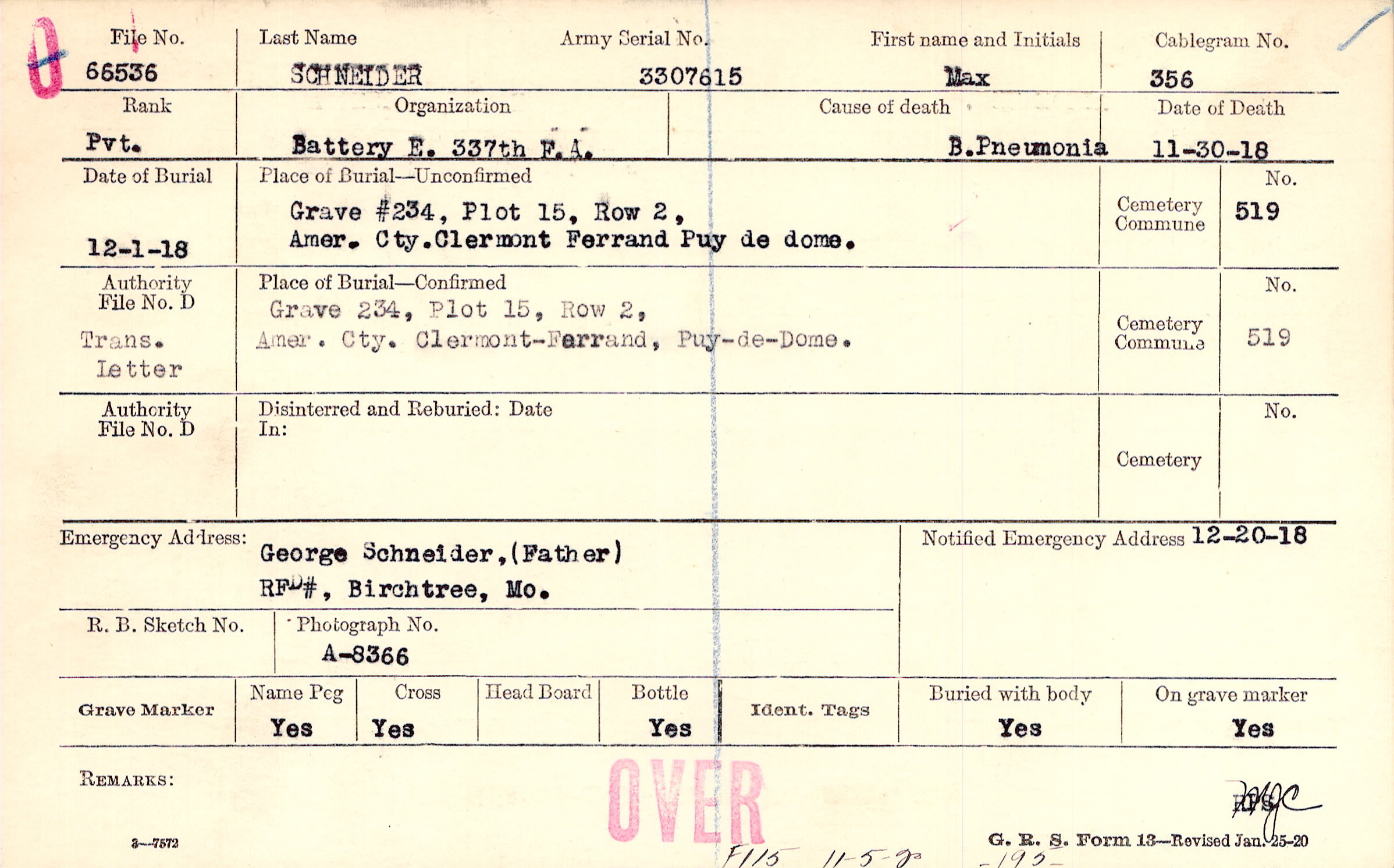 Grave 234, Plot 15, Row 2, Amer. Cty., Clermont-Ferrand, Puy-de-Dome