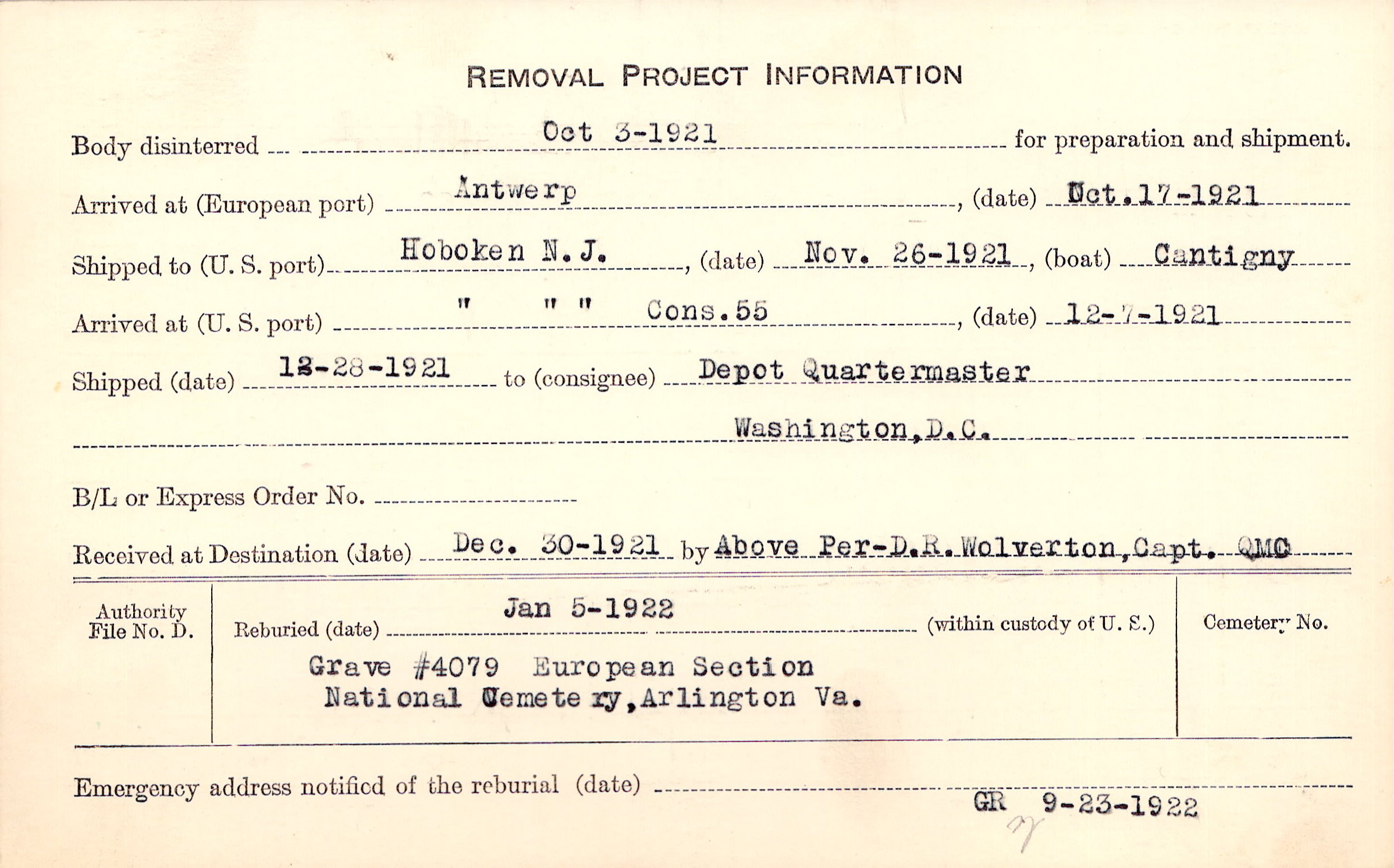 Body disinterred 10/3/1921 for preparation and shipment.