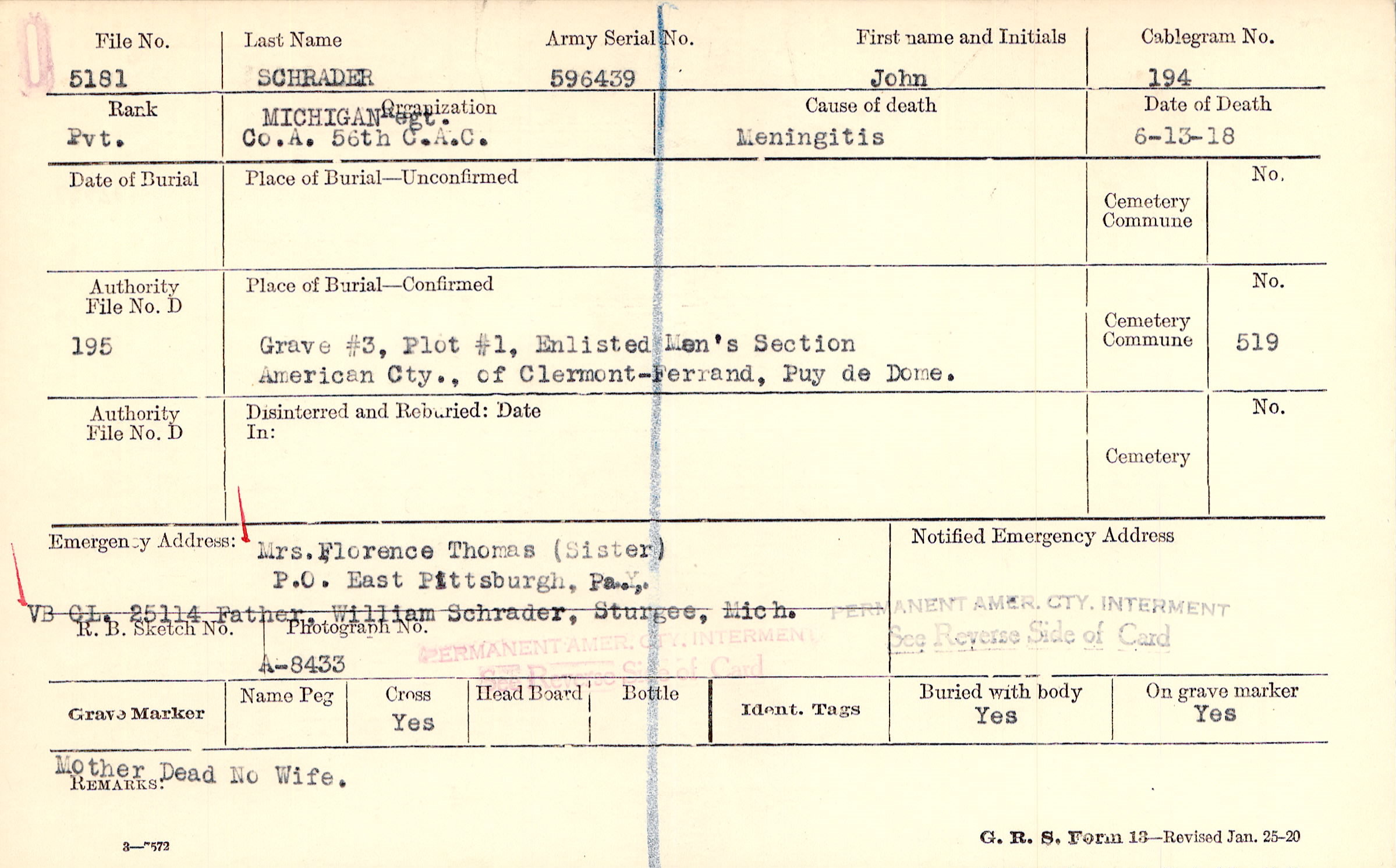 Mrs. Florence Thomas (Sister), P.O. East Pittsburgh, Pa.,, VB CL. 25114 Father, William Schrader, Sturgee, Mich.