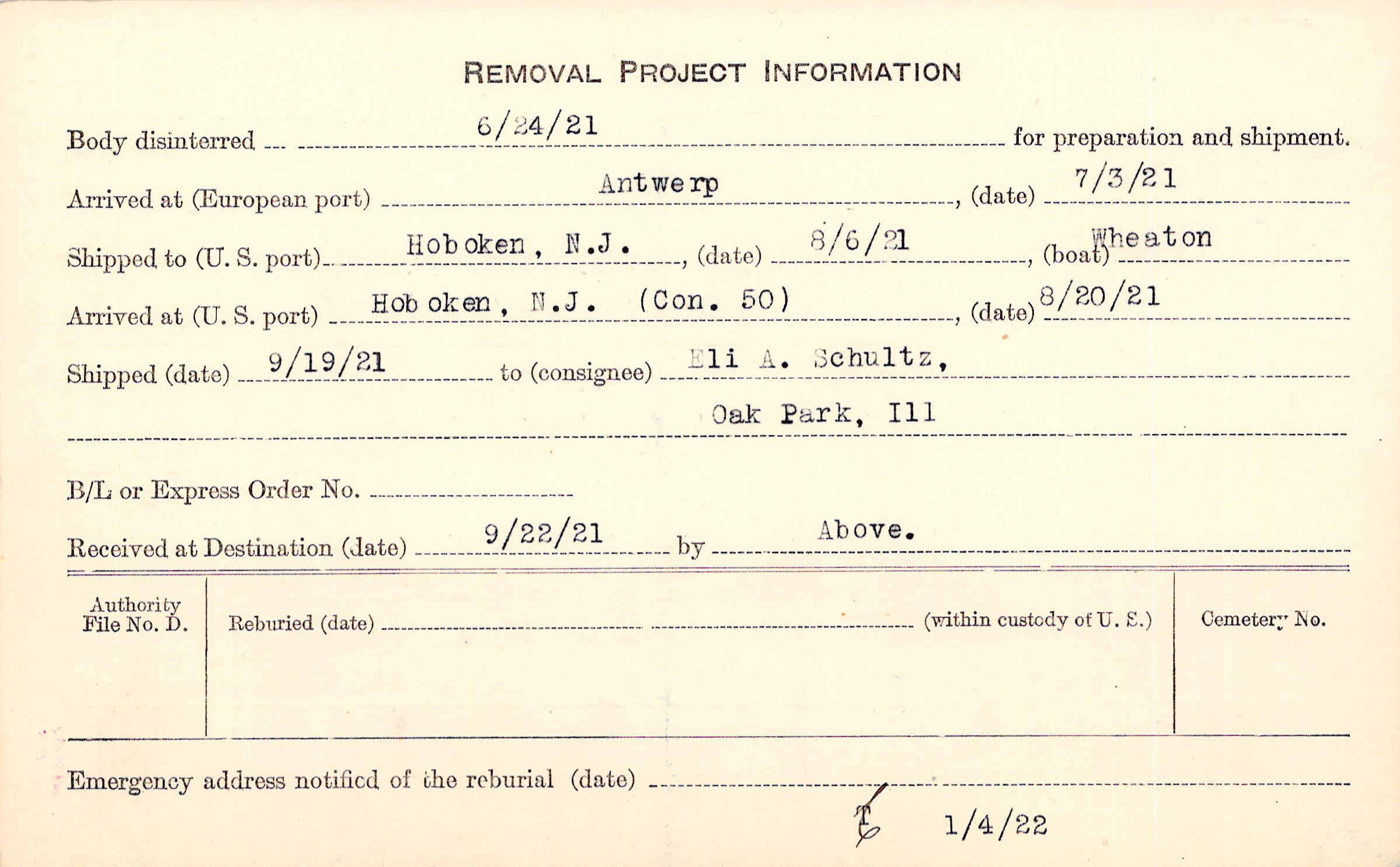Body disinterred 6/24/1921 for preparation and shipment.