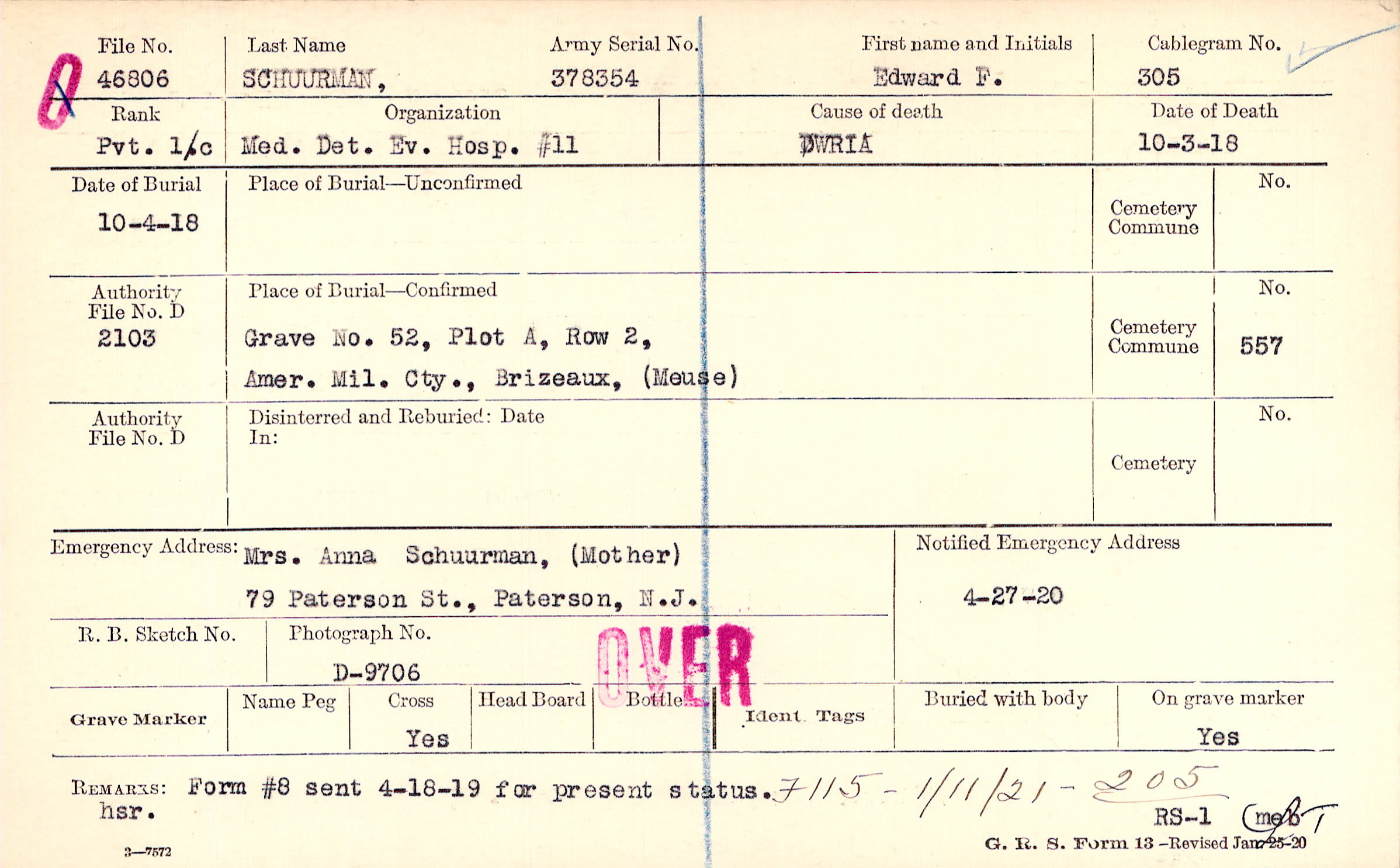Mrs. Anna Schuurman, (Mother), 79 Paterson St., Paterson, N.J.