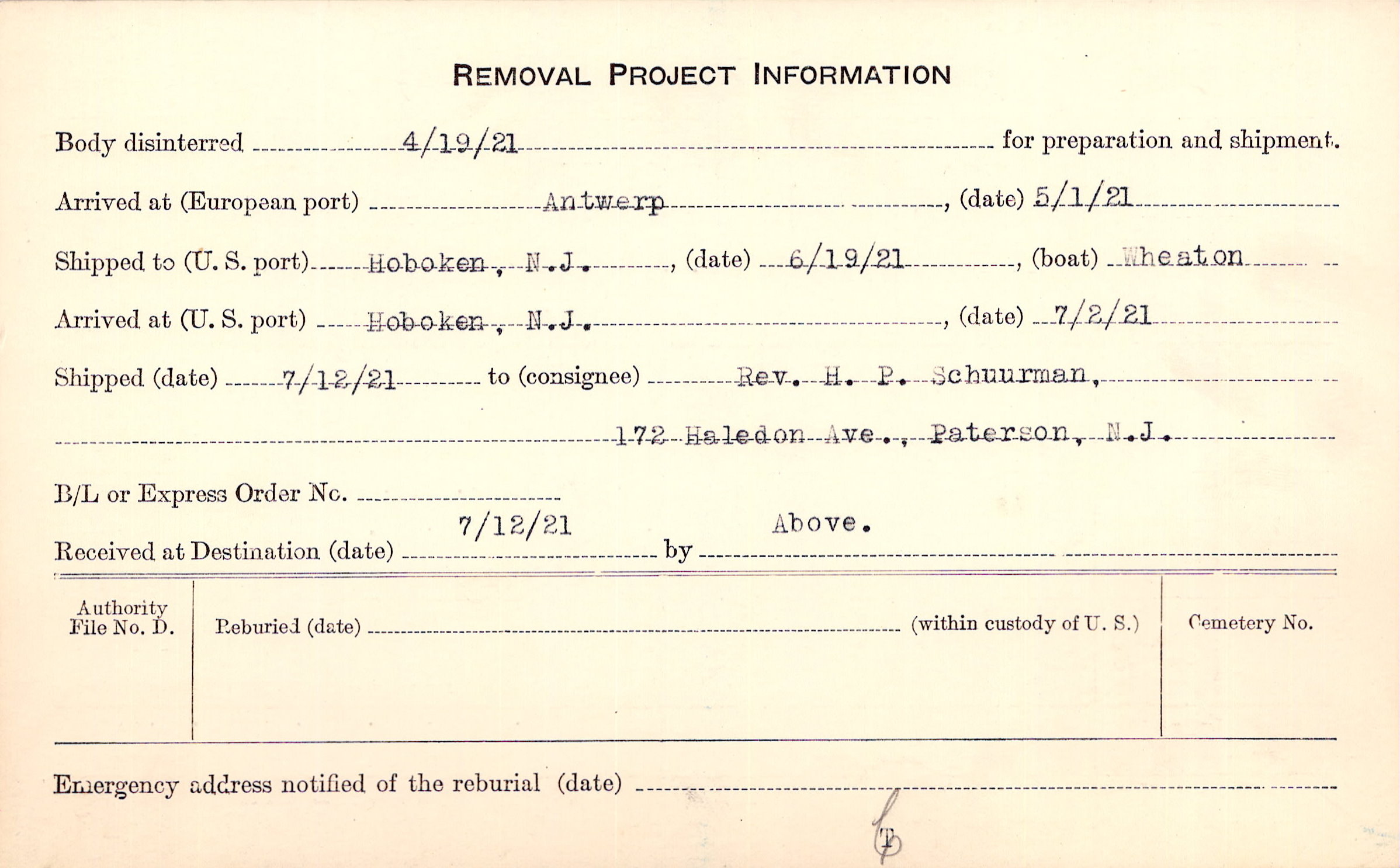 Body disinterred 4/19/1921 for preparation and shipment.