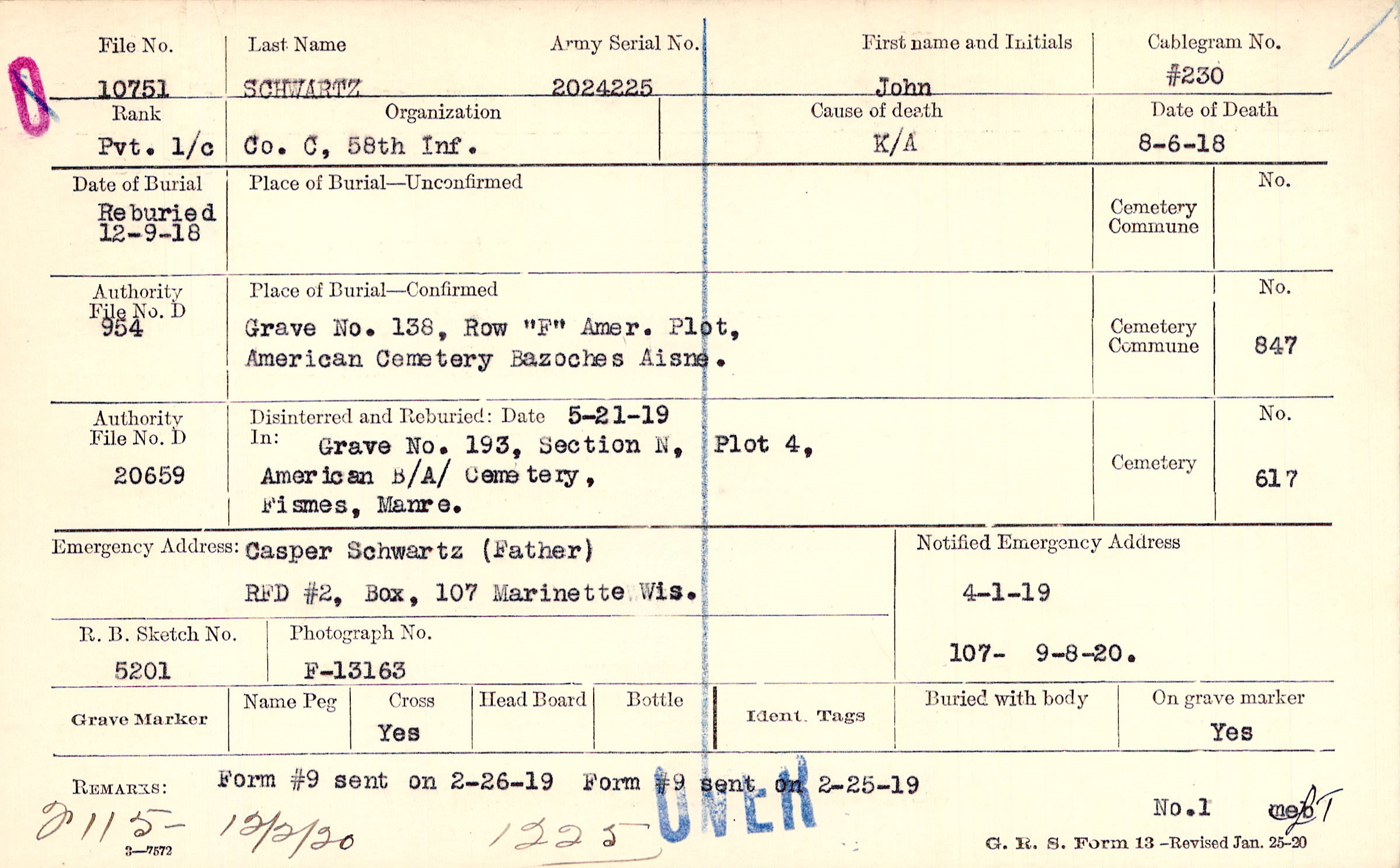 Casper Schwartz (Father), RFD #2, Box, 107 Marinette Wis.