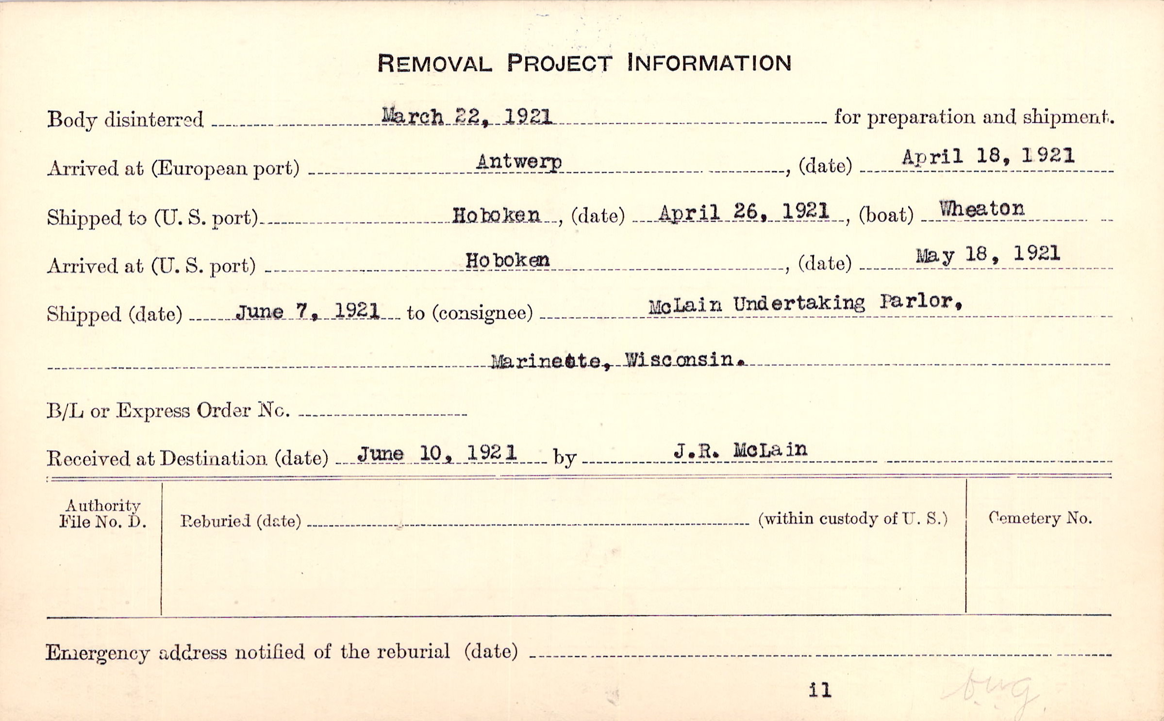Body disinterred 3/22/1921 for preparation and shipment.