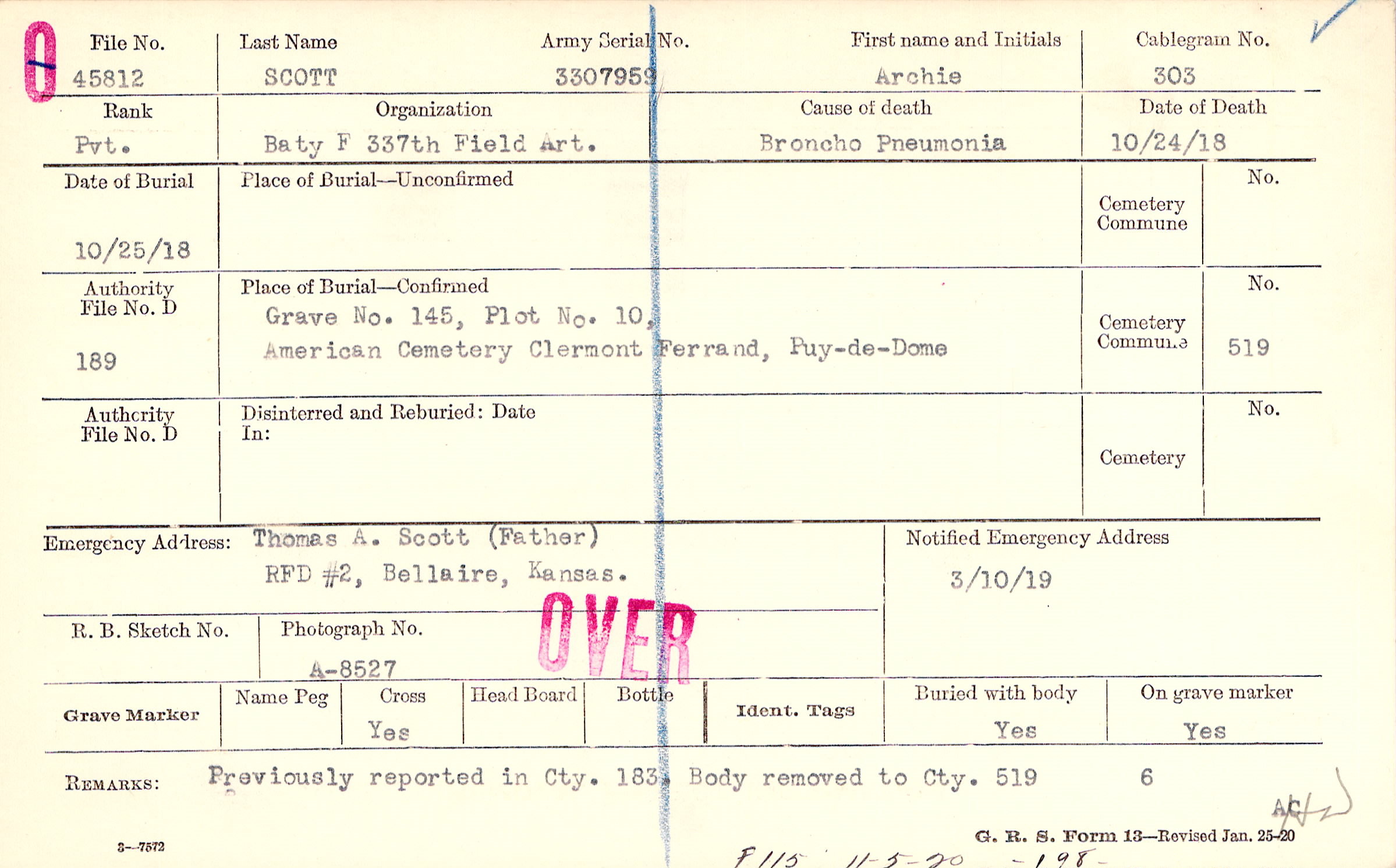 Grave 145, Plot 10, American Cemetery, Clermont Ferrand, Puy-de-Dome