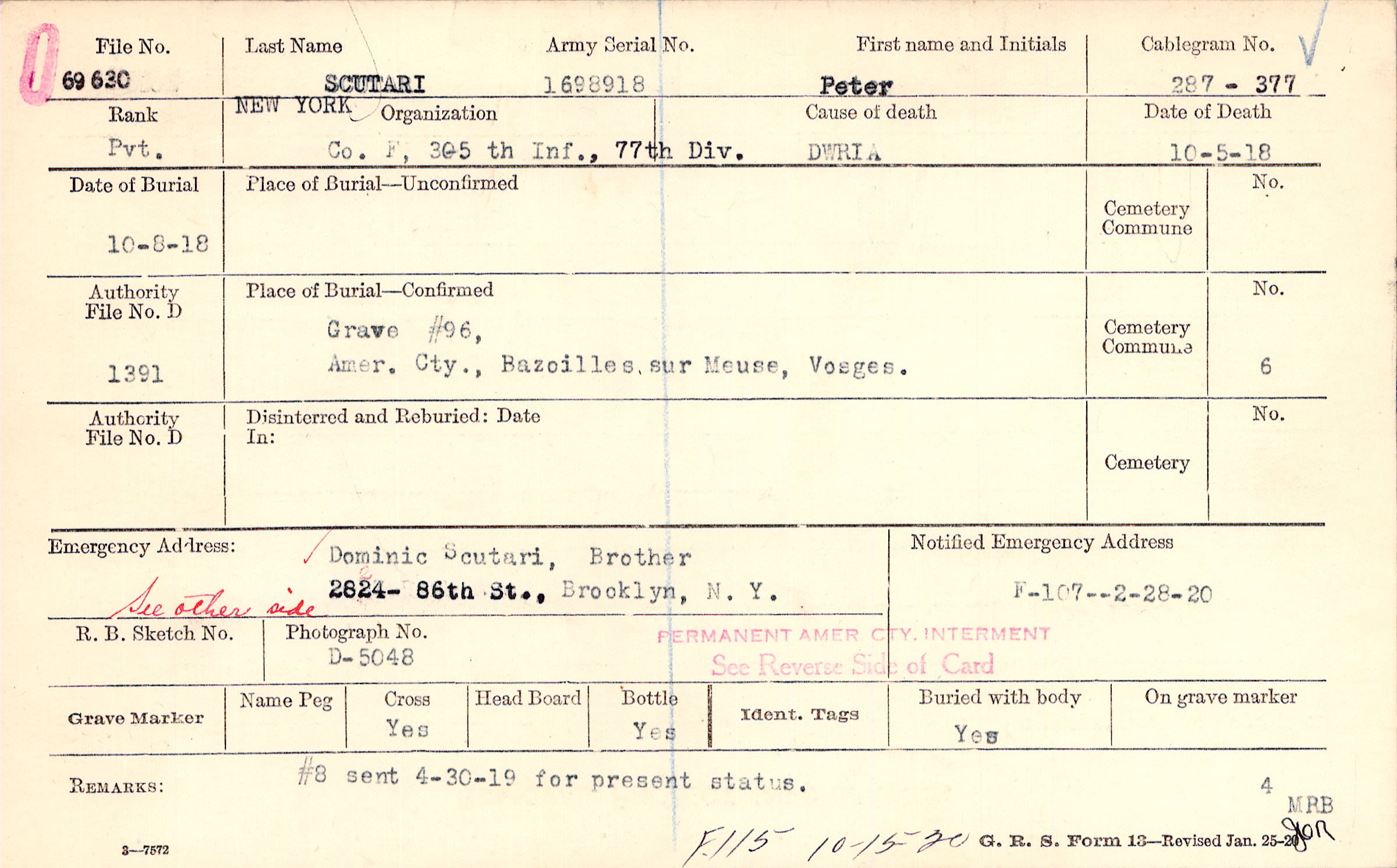 Dominic Scutari, Brother, 2824- 86th St., Brooklyn, N.Y., See other side