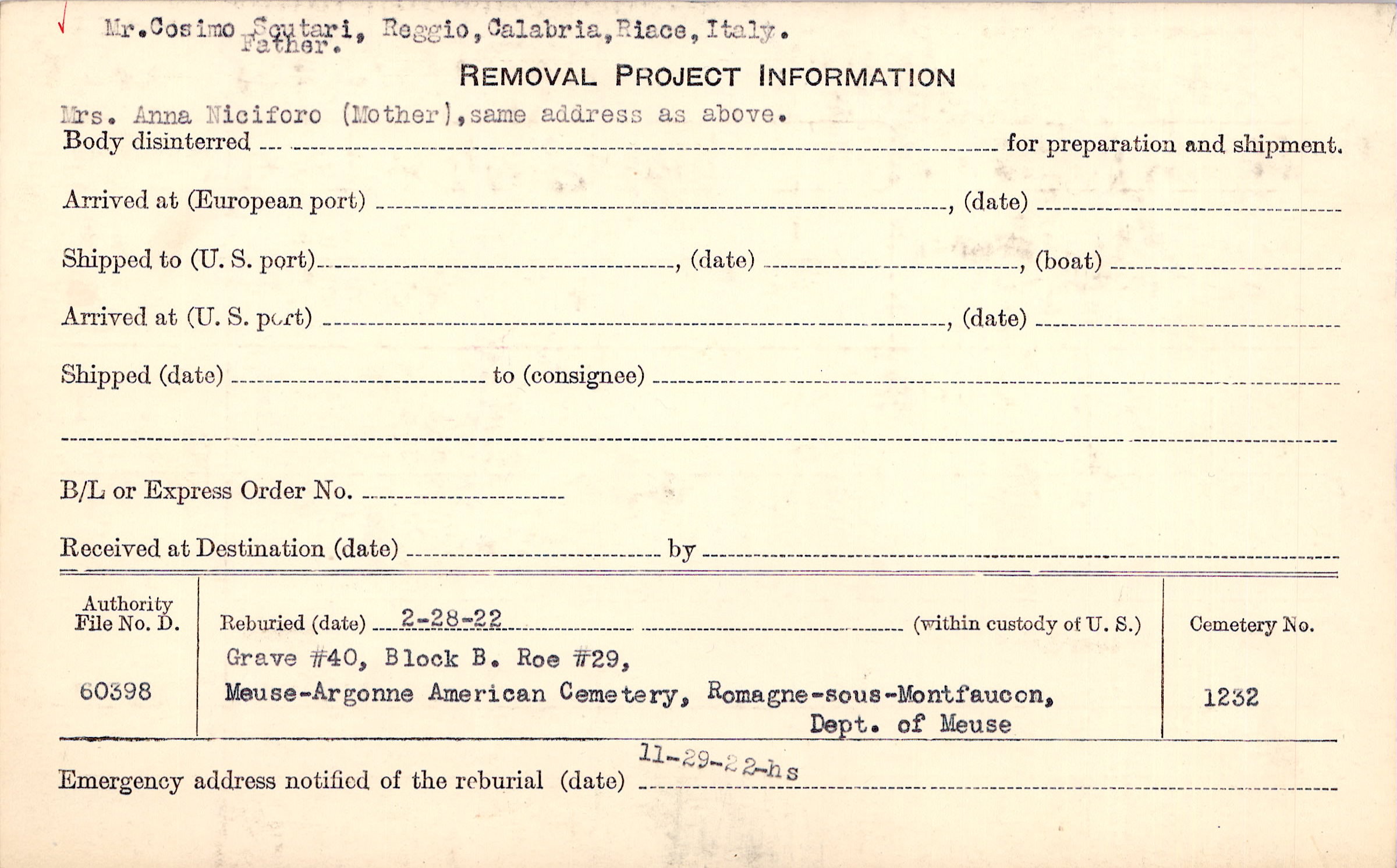 Mr. Cosimo Scutari, Reggio, Calabria, Riace, Italy., Father., Mrs. Anna Niciforo (Mother), same address as above. |