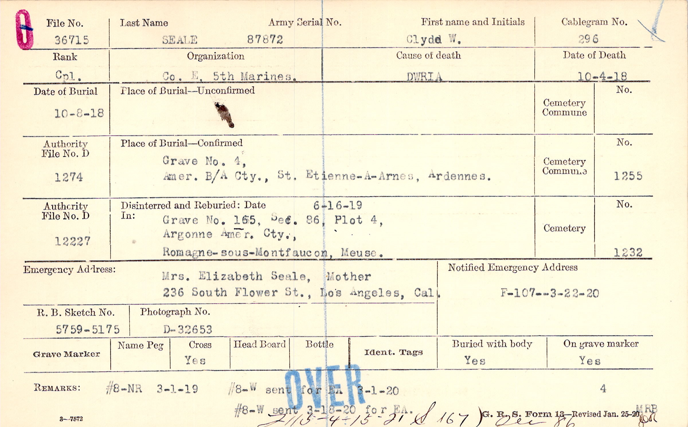 Grave 4,Amer. B/A Cty., St. Etienne-A-Arnes, Ardennes.,6-16-19,Grave 165, Sec. 86, Plot 4,Argonne Amer. Cty.,Romagne-sous-Montfaucon, Meuse.