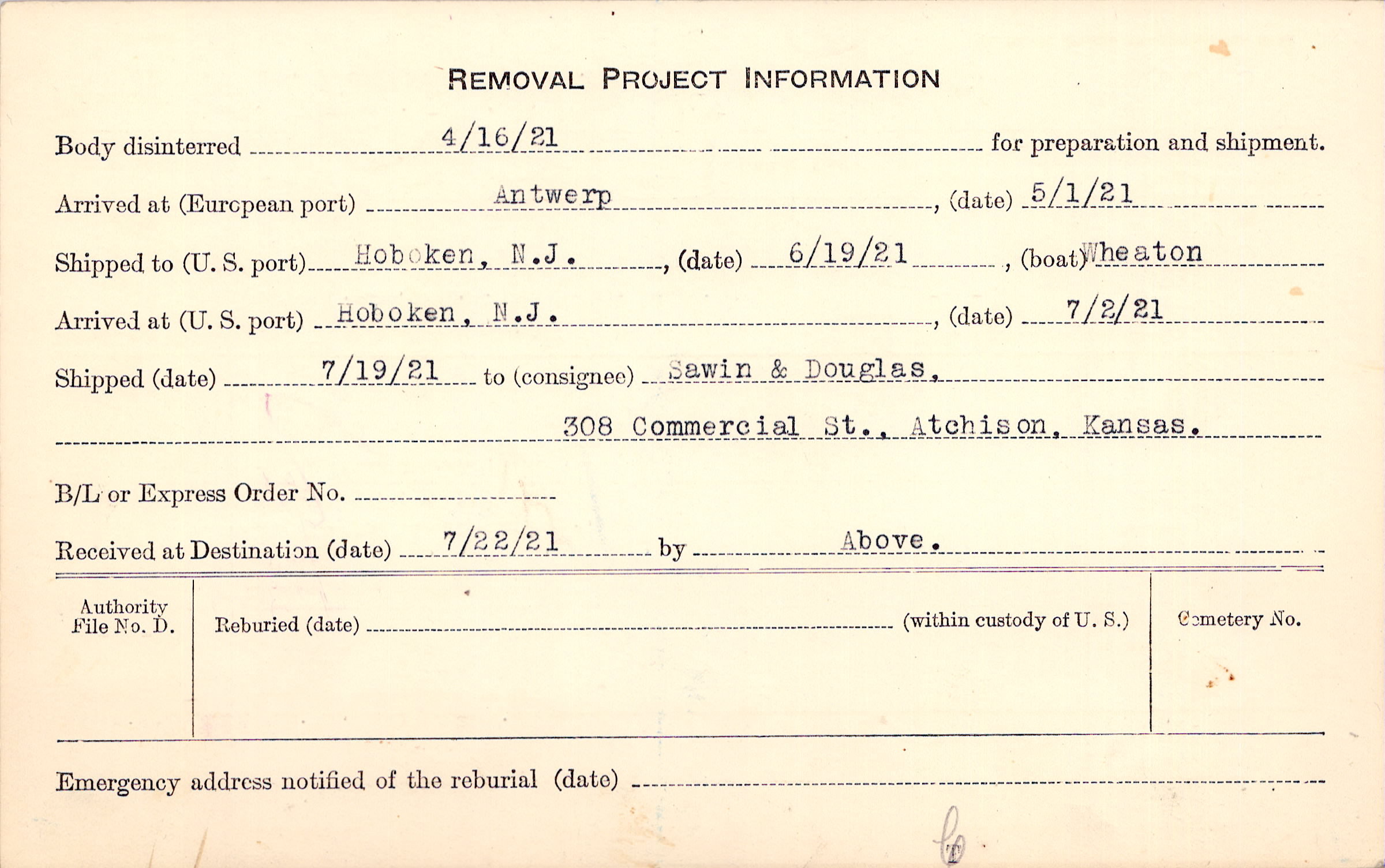 Body disinterred 4/16/1921 for preparation and shipment.