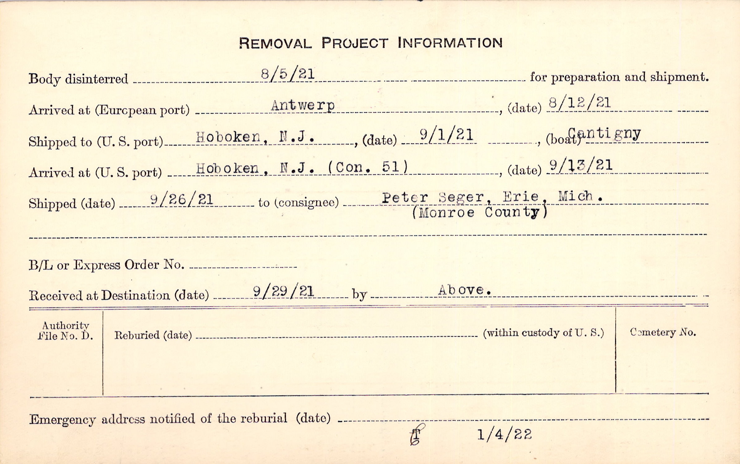 Body disinterred 8/5/1921 for preparation and shipment.