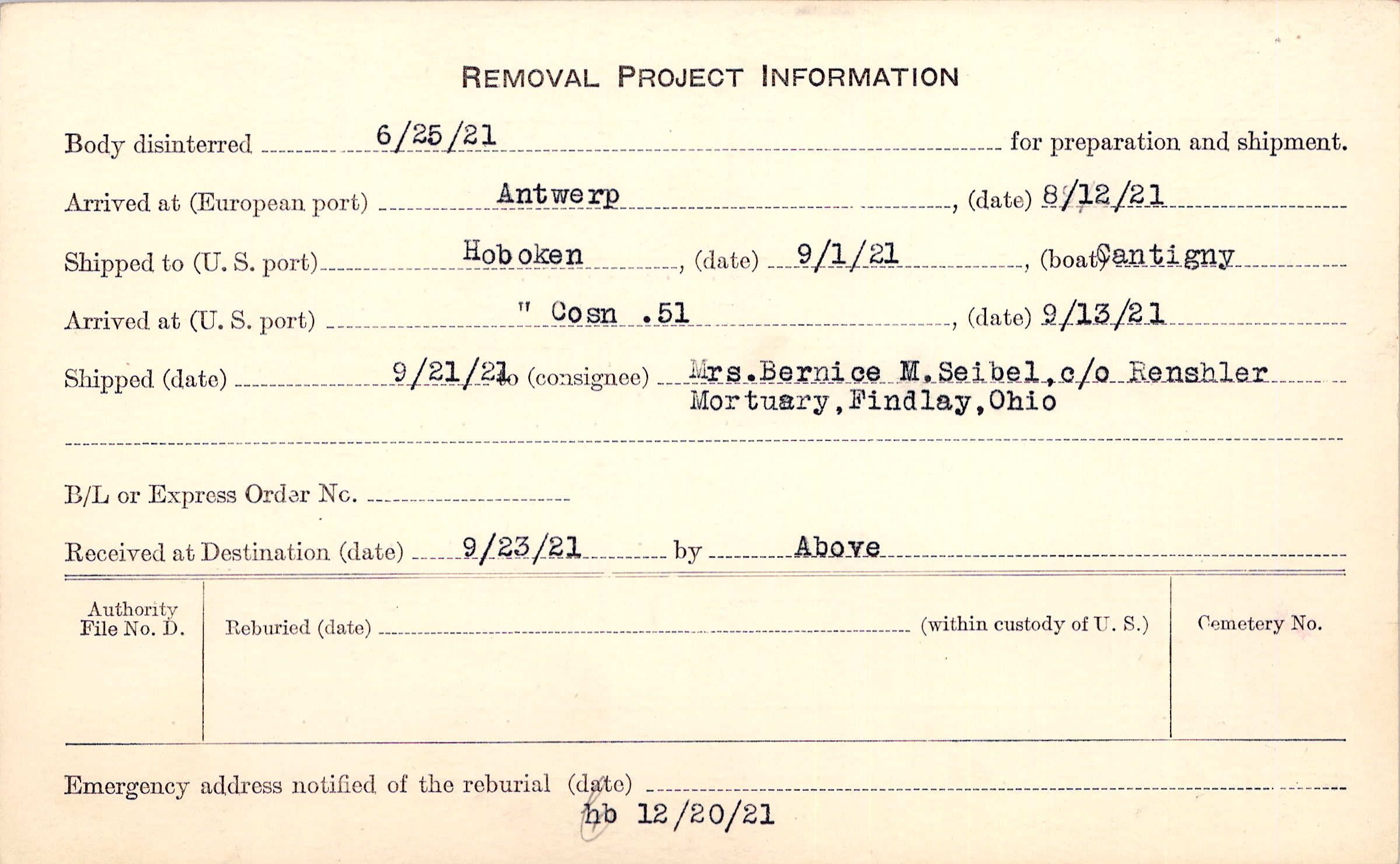 to Mrs. Bernice M. Seibel, c/o Renshler Mortuary, Findlay, Ohio