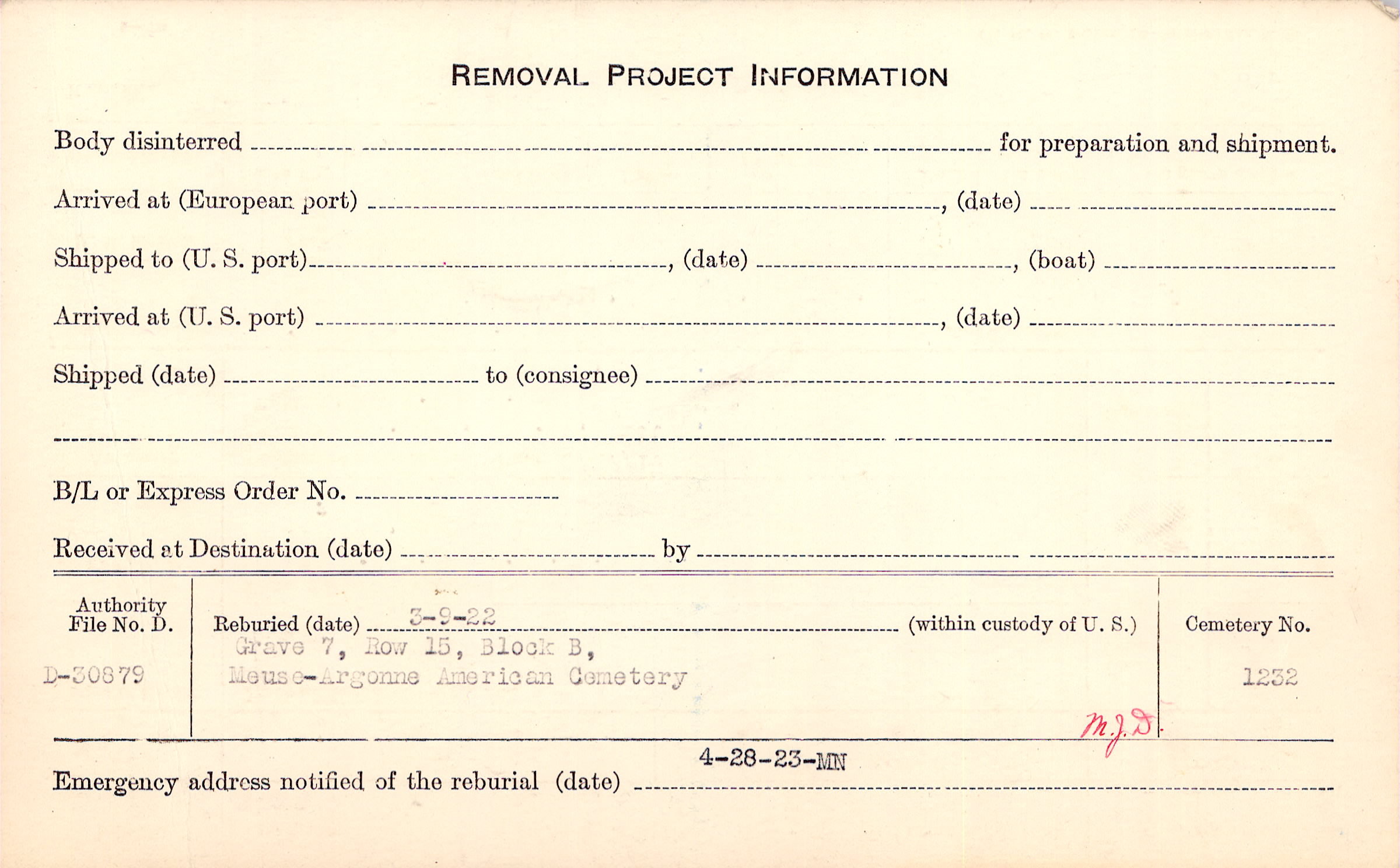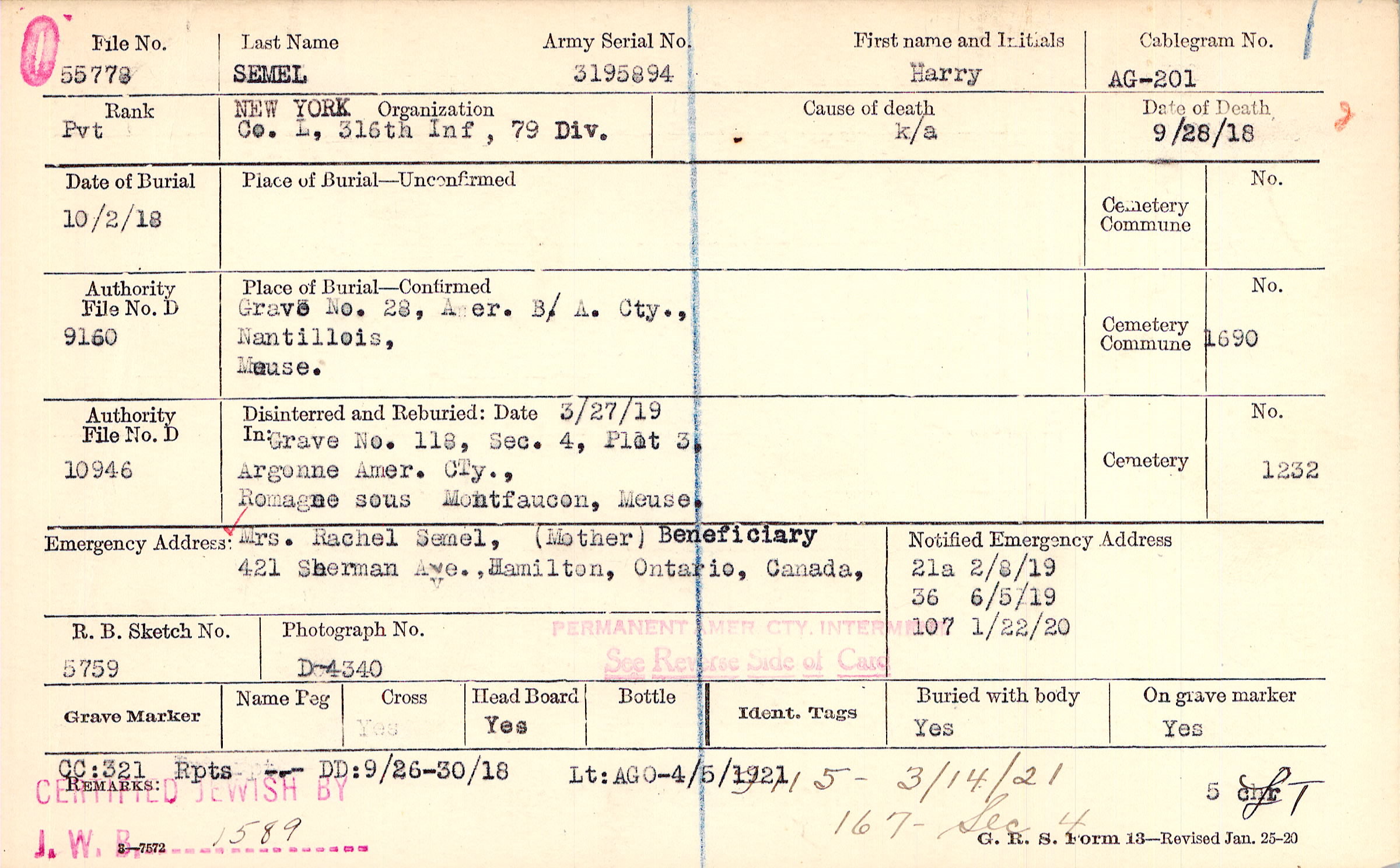 Grave 28, Amer. B/ A. Cty., Nantillois, Meuse.