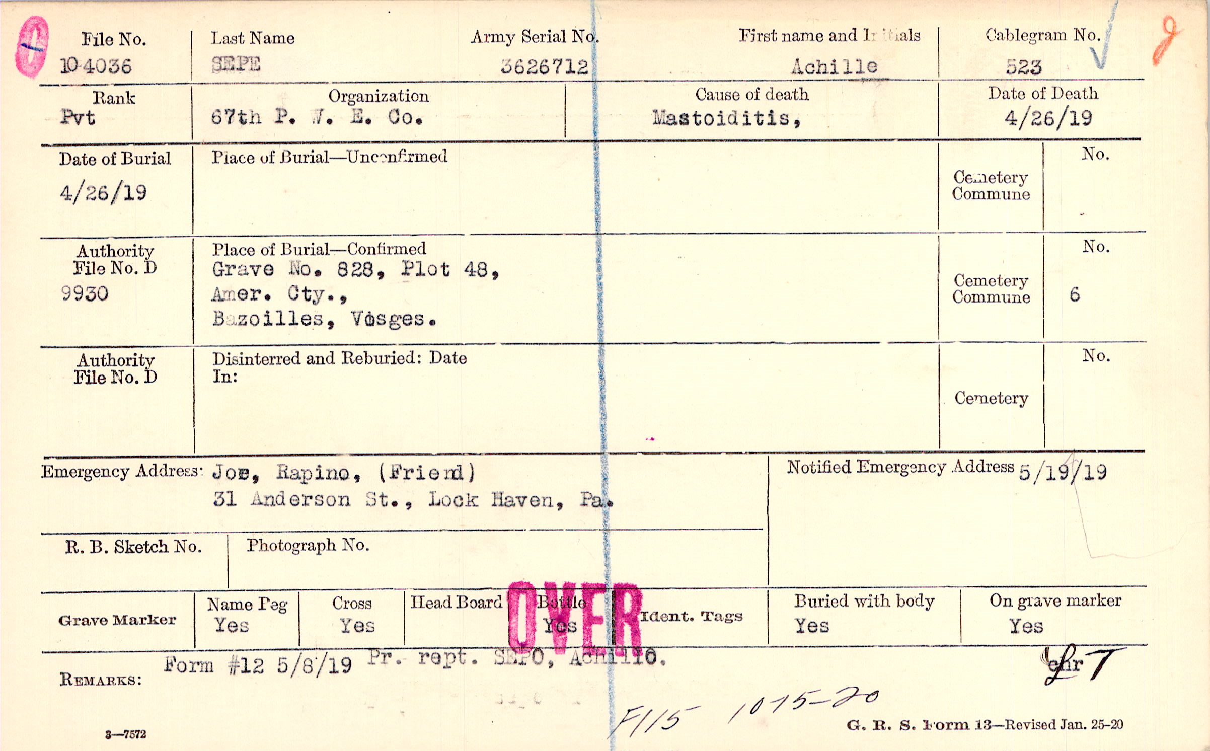 Grave 828, Plot 48, Amer. Cty., Bazoilles, Vosges.
