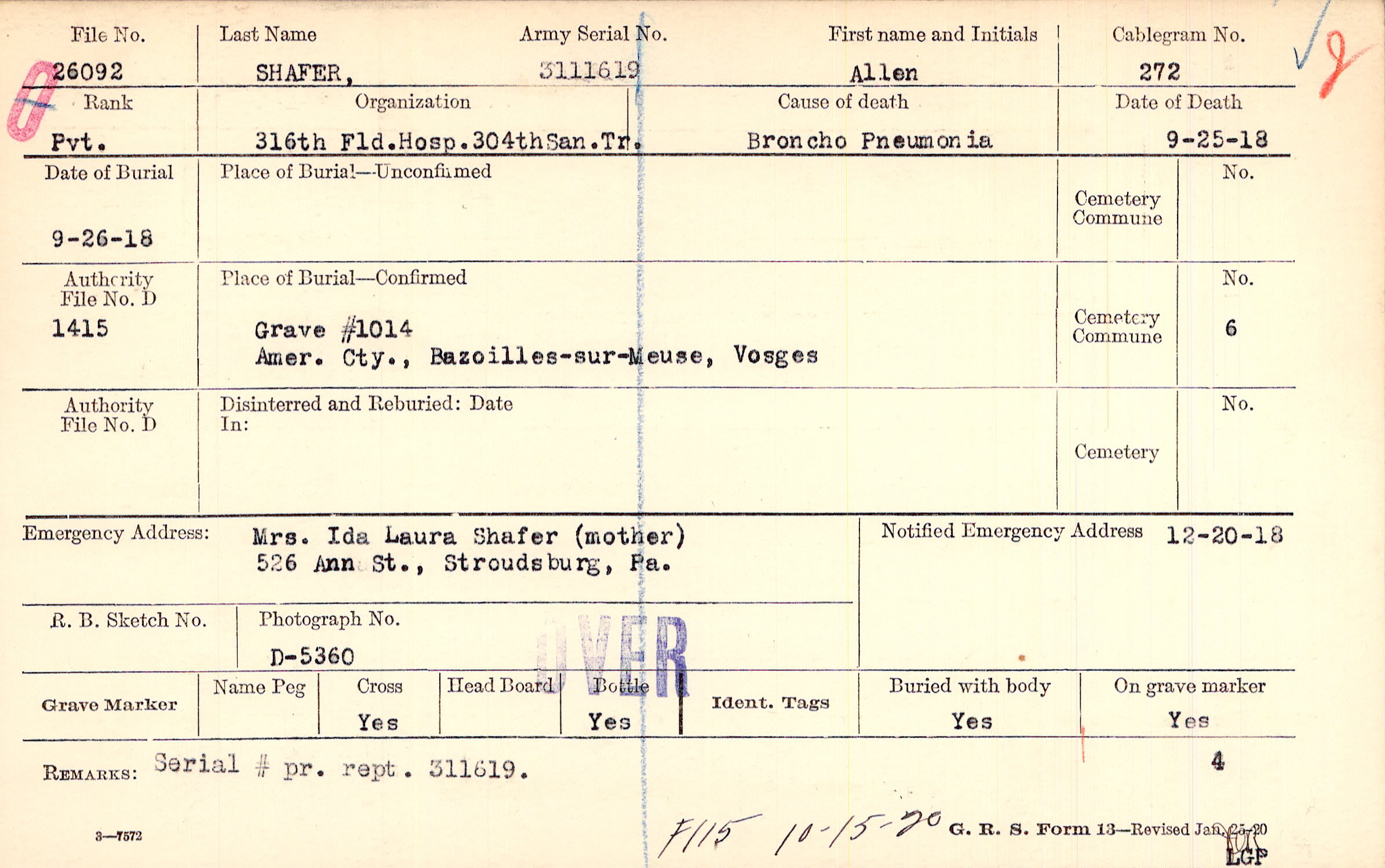 Grave #1014, Amer. Cty., Bazoilles-sur-Meuse, Vosges
