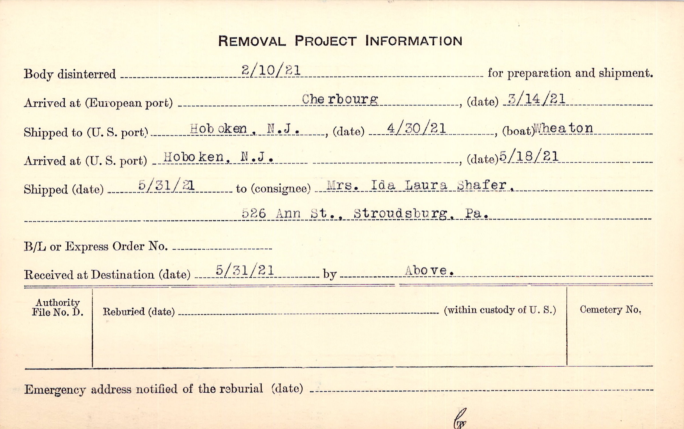 Body disinterred 2/10/1921 for preparation and shipment.