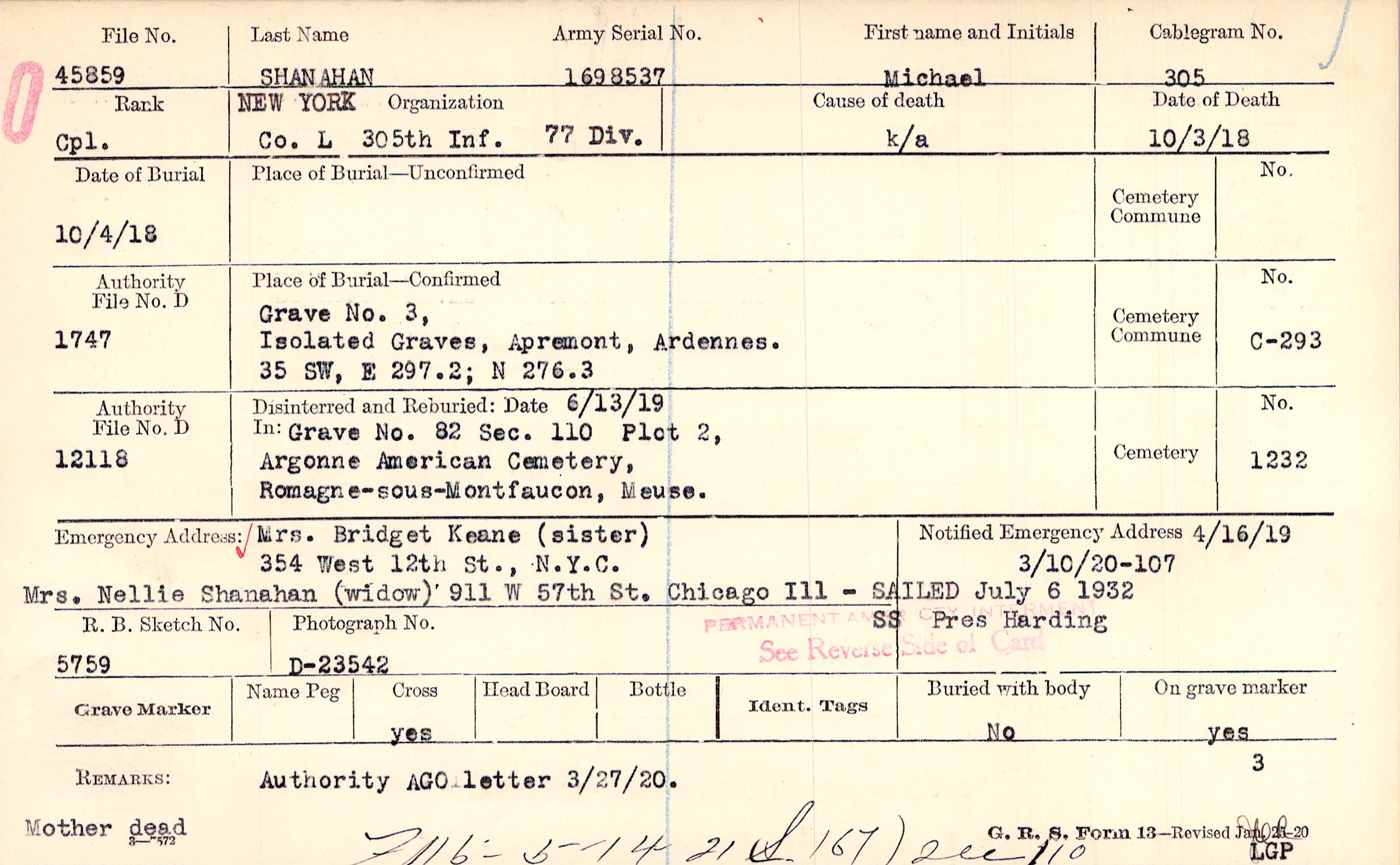 Mrs. Bridget Keane (sister), 354 West 12th St., N.Y.C., Mrs. Nellie Shanahan (widow) 911 W 57th St. Chicago Ill - SAILED July 6 1932 SS Pres Harding