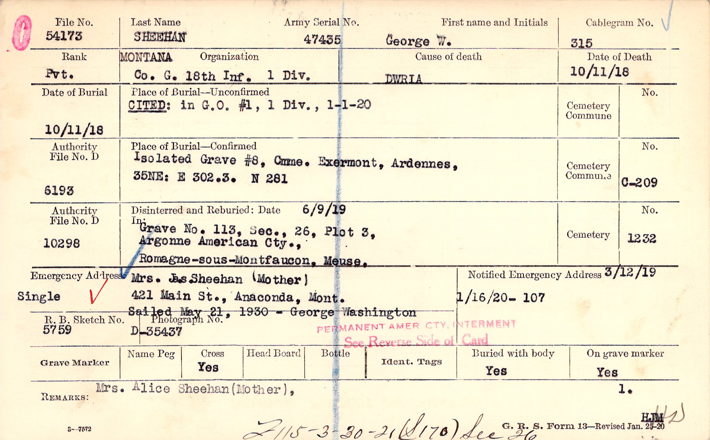Mrs. Ja.s .Sheehan (Mother), 421 Main St., Anaconda, Mont., Single Sailed May 21, 1930 - George Washington