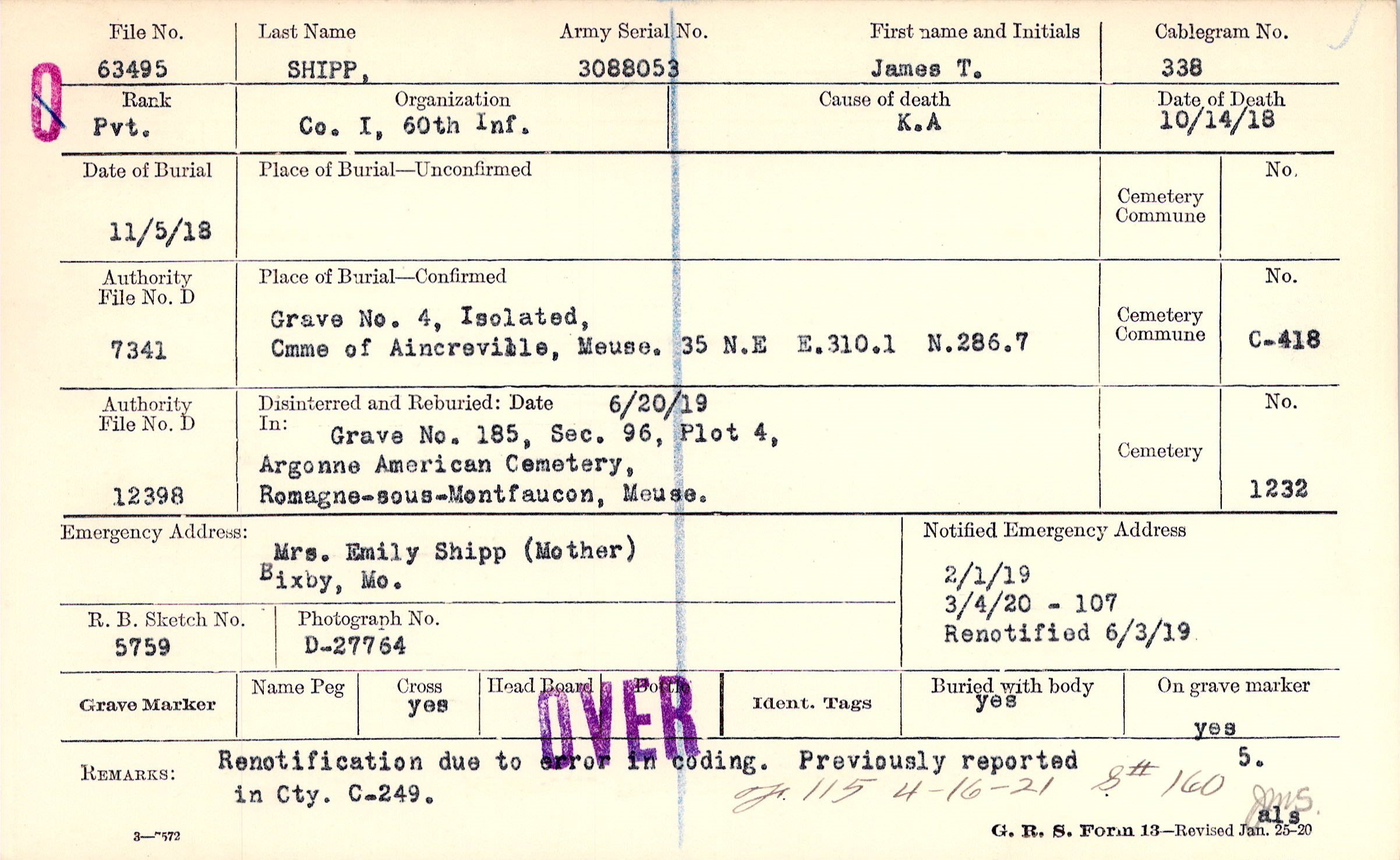 2/1/1919, Form 107: 3/4/1920, Renotified 6/3/1919