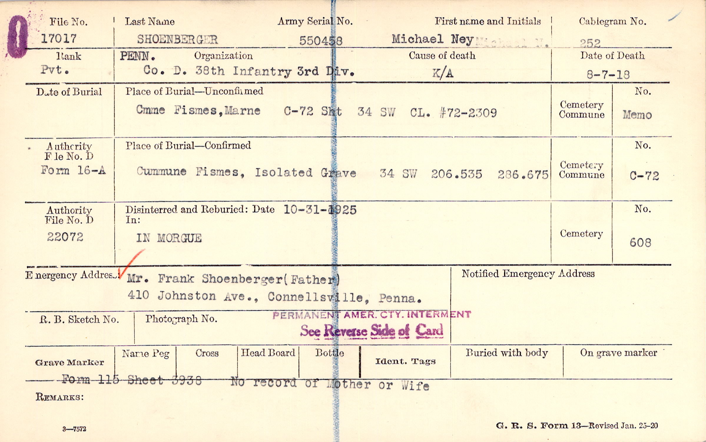 Mr. Frank Shoenberger (Father), 410 Johnston Ave., Connellsville, Penna.