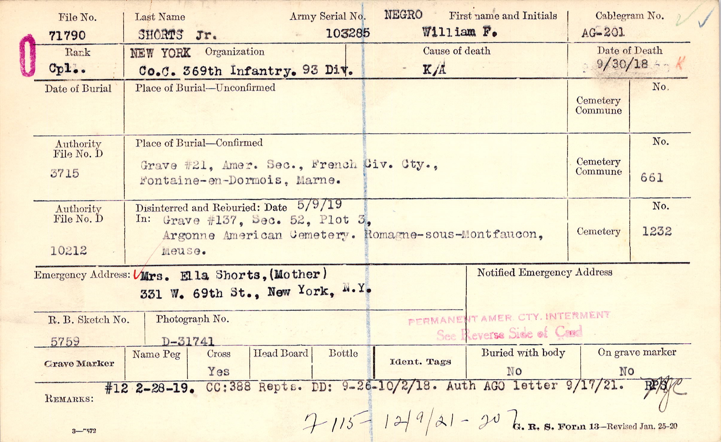 Grave #21, Amer. Sec., French Civ. Cty., Fontaine-en-Dormois, Marne.
