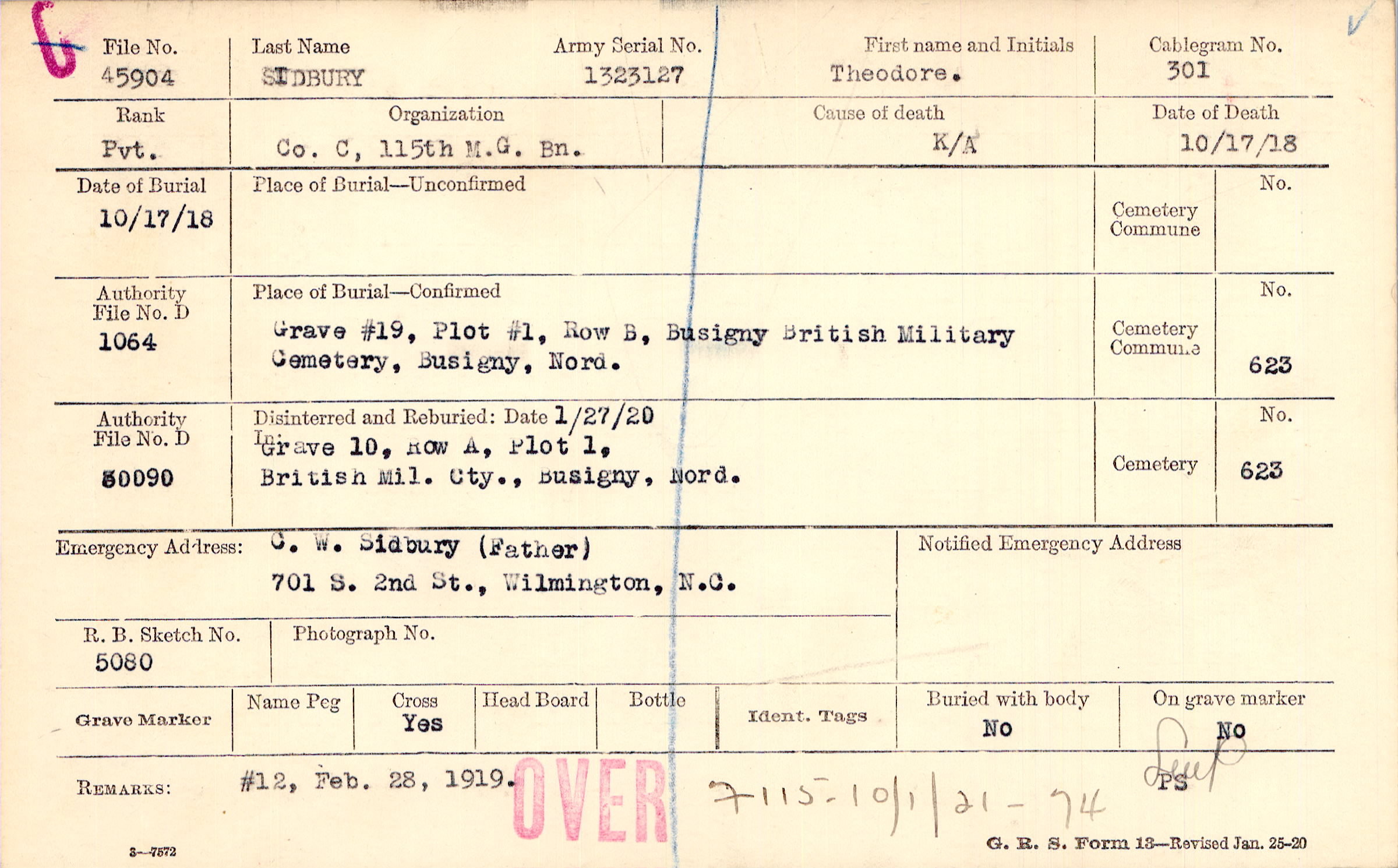 C. W. Sidbury (Father), 701 S. 2nd St., Wilmington, N.C.