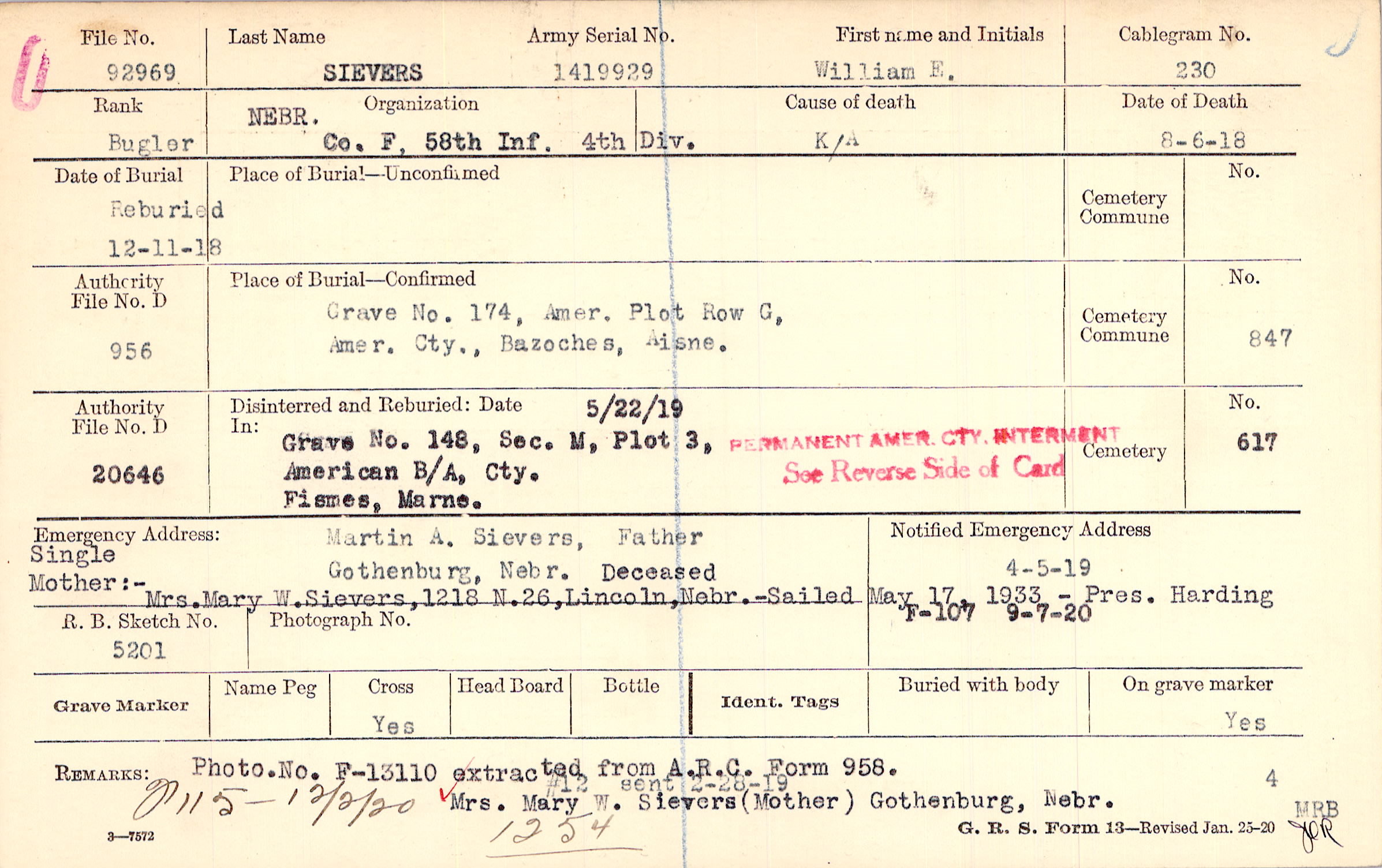 Photo. No. F-13110 extracted from A.R.C. Form 958. Mrs. Mary W. Sievers (Mother) Gothenburg, Nebr., #12 sent 2-28-19, F115 - 12/2/20 1254