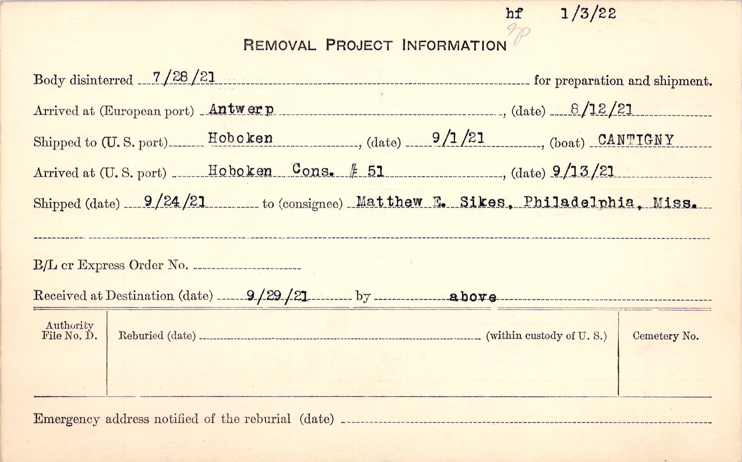 Body disinterred 7/28/1921 for preparation and shipment.