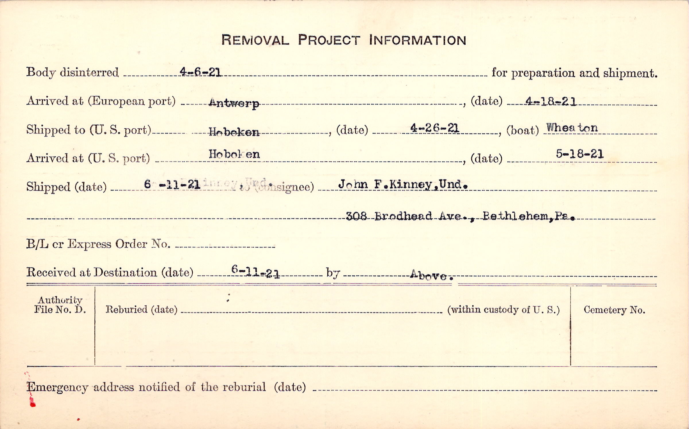 Body disinterred 4/6/1921 for preparation and shipment.