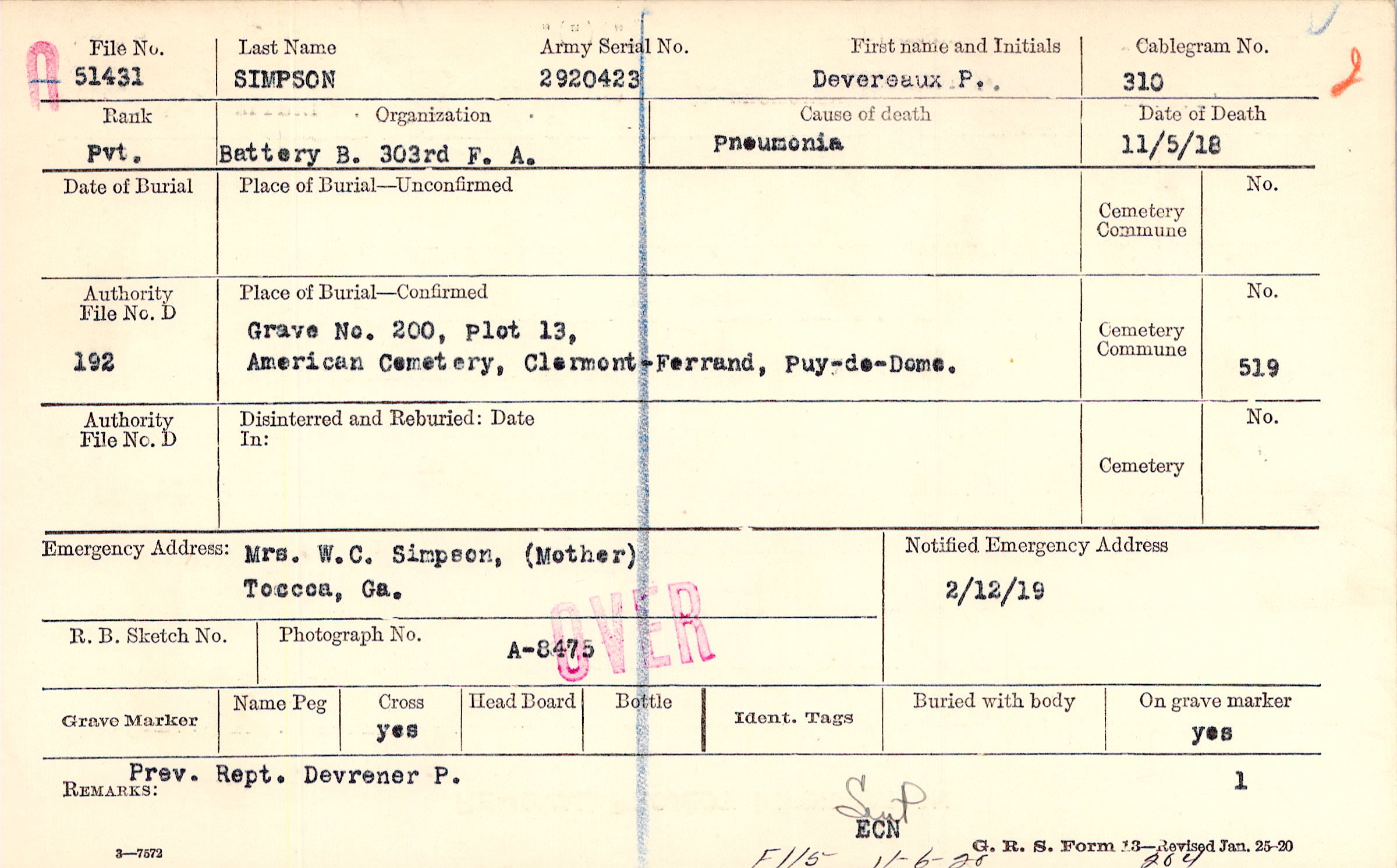Grave 200, Plot 13, American Cemetery, Clermont-Ferrand, Puy-de-Dome