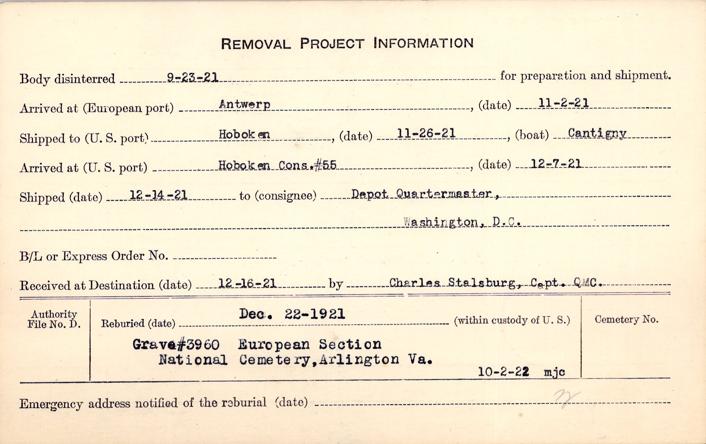 Body disinterred 9/23/1921 for preparation and shipment.