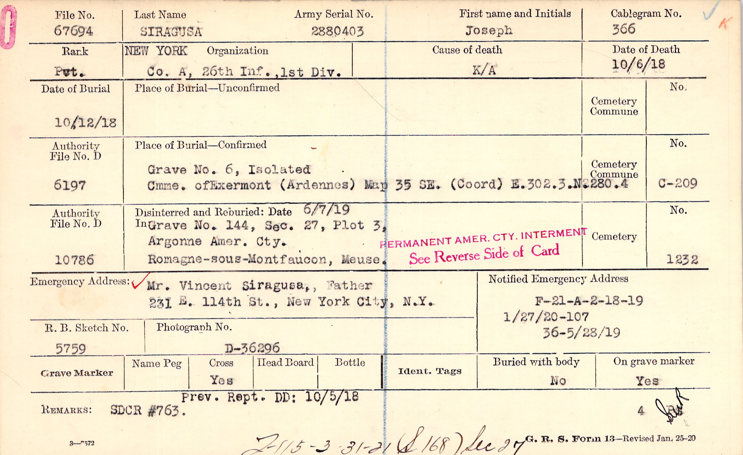 Mr. Vincent Siragusa, Father, 231 E. 114th St., New York City, N.Y.