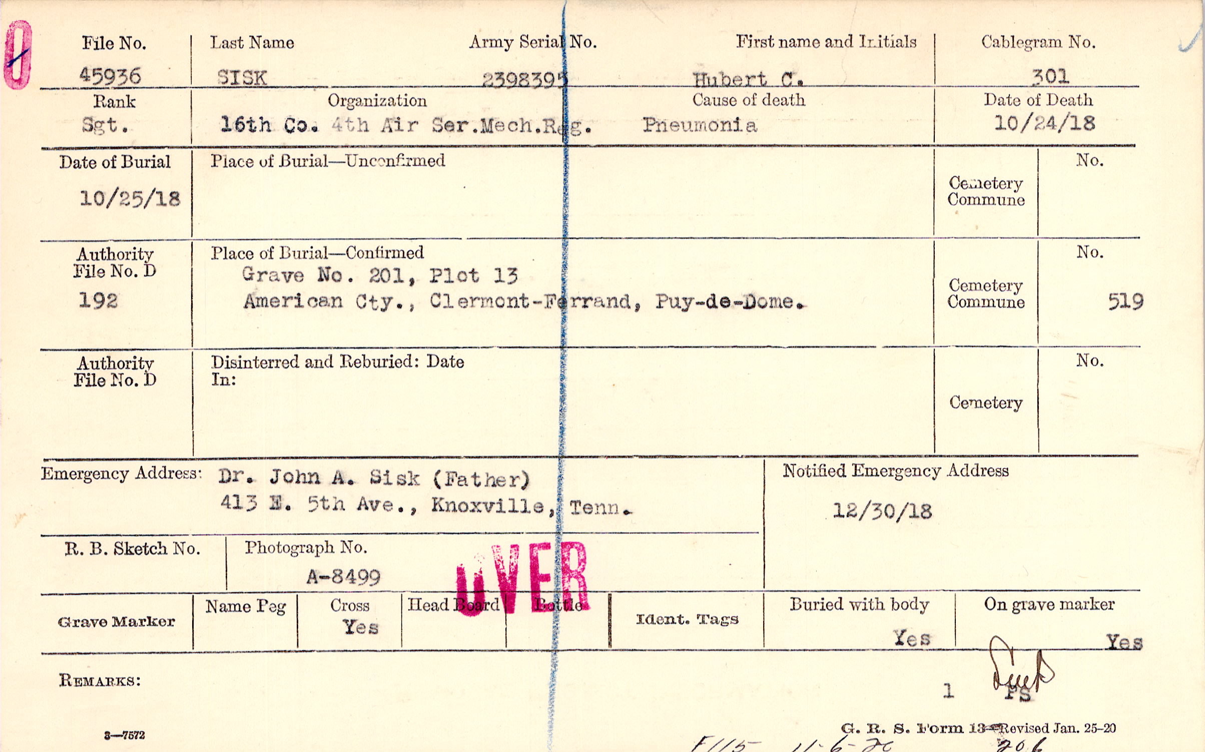 Grave 201, Plot 13, American Cty.,Clermont - Ferrand, Puy-de-Dome.,