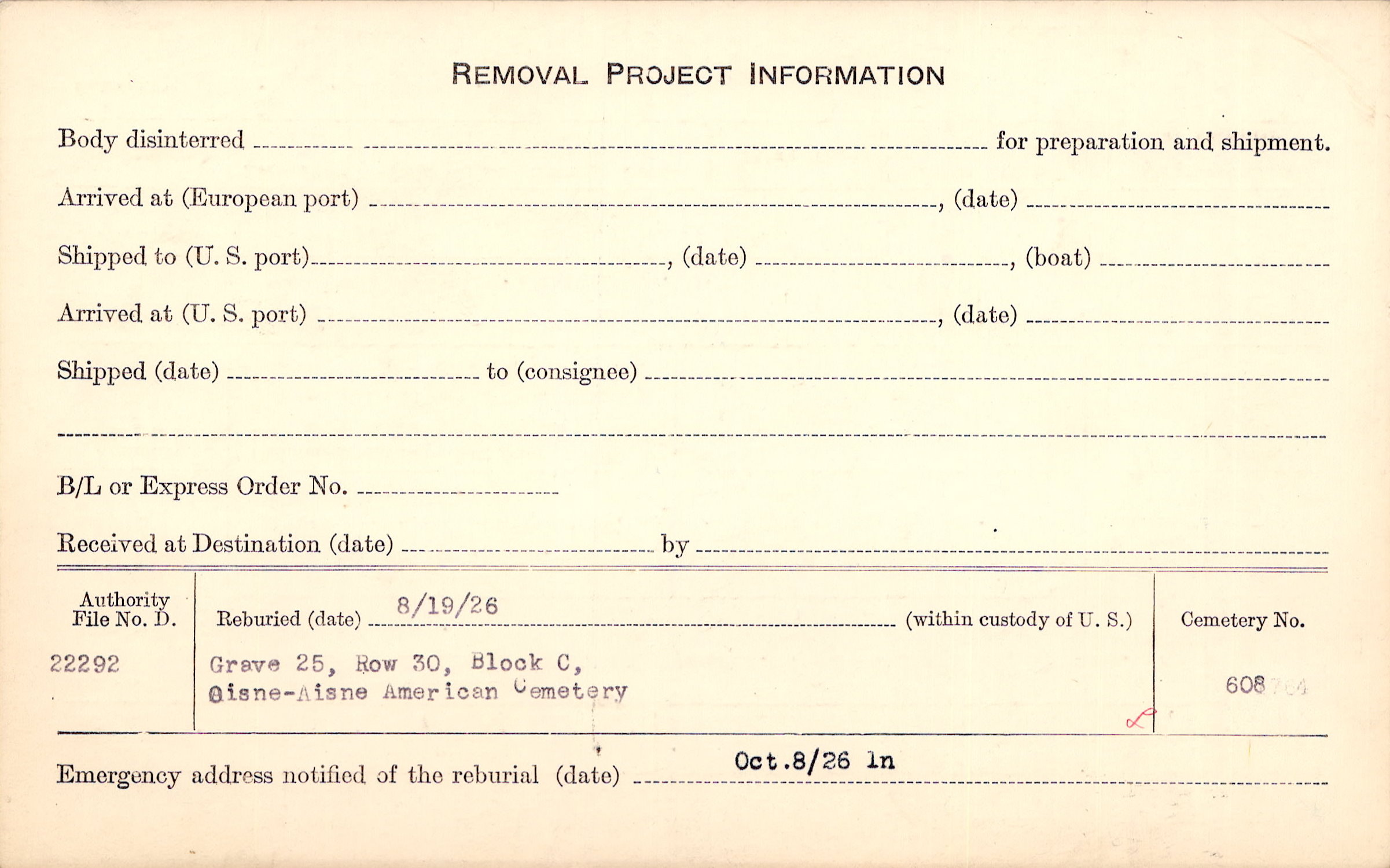 American B/A Cemetery, Seringes-et-Nesles, Aisne, Body held in Morgue