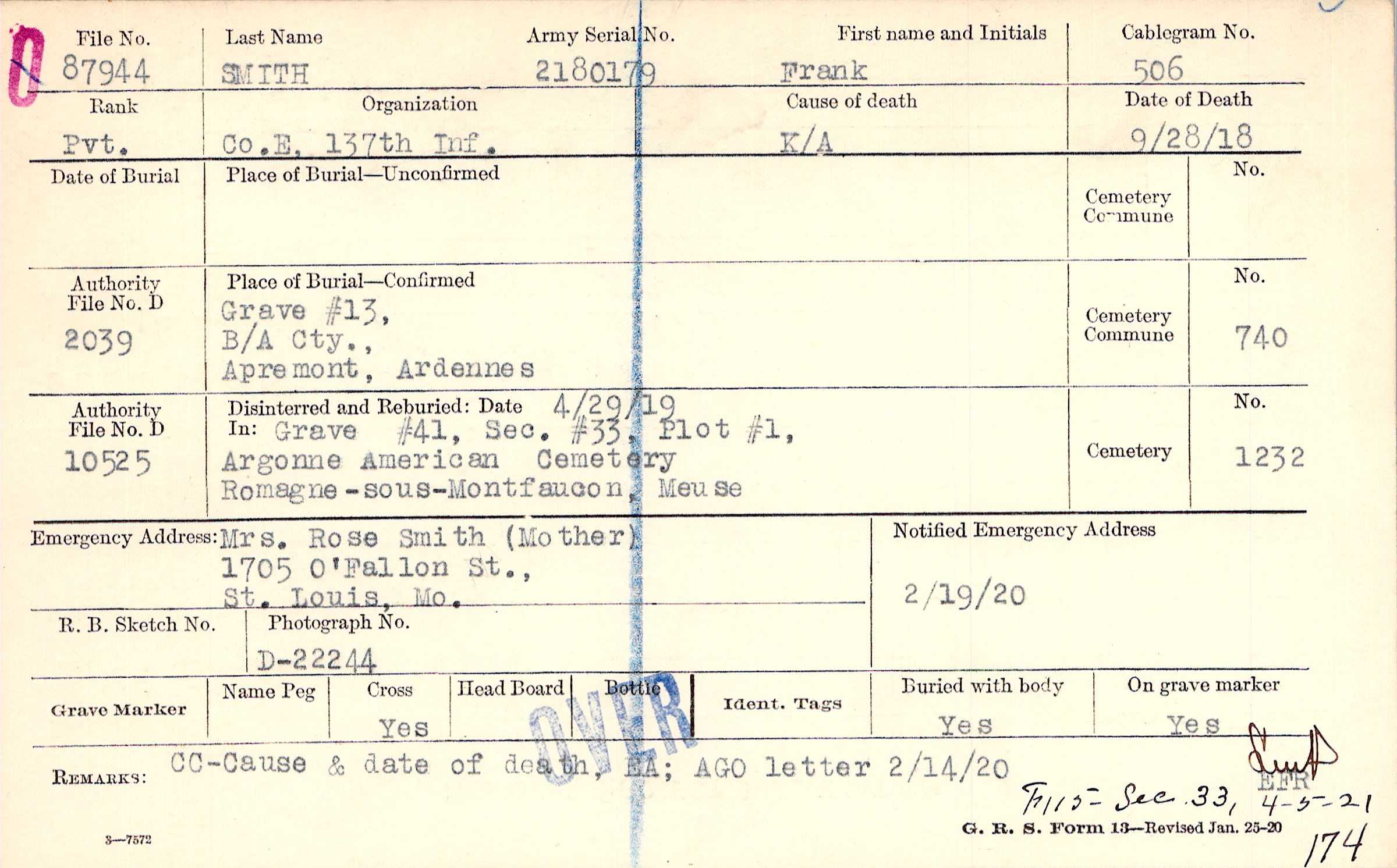 Grave #13, B/A Cty., Apremont, Ardennes.