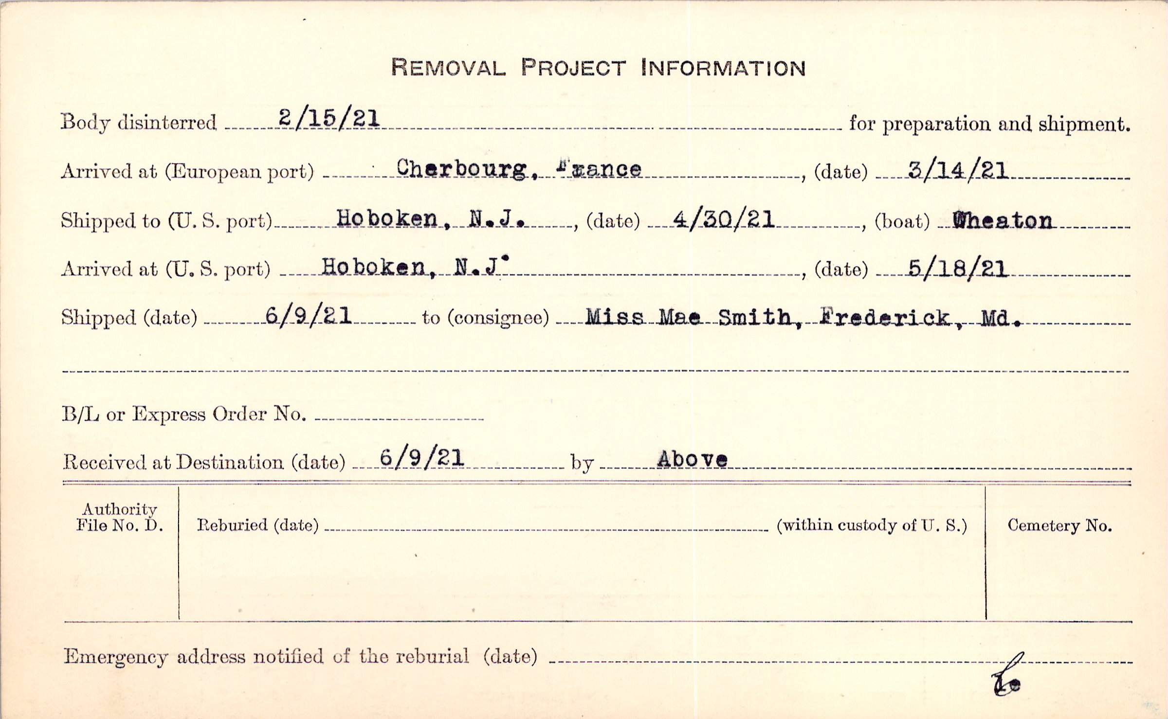 Miss May Smith, (Sister), Braddock, Heights. Md., Beneficiary