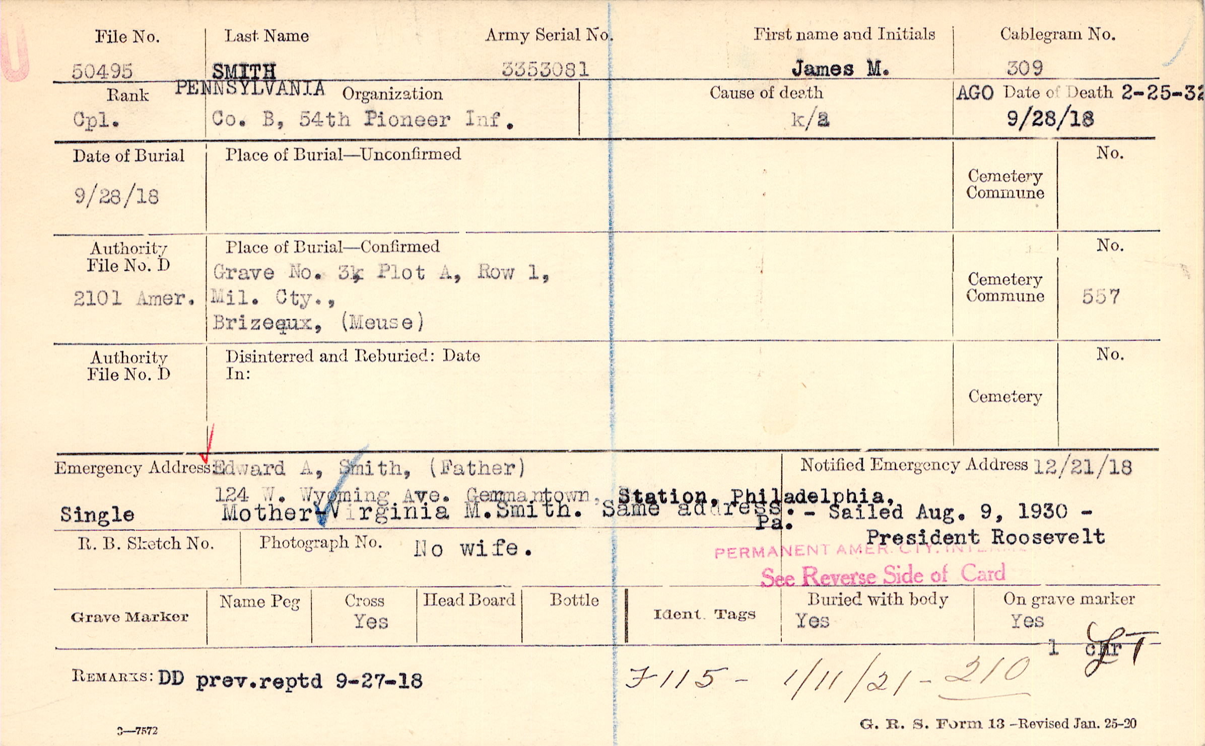 Edward A, Smith, (Father), 124 W. Wyoming Ave. Germantown Station, Philadelphia, Pa., Single Mother - Virginia M. Smith. Same address. - Sailed Aug. 9, 1930 - President Roosevelt No wife.