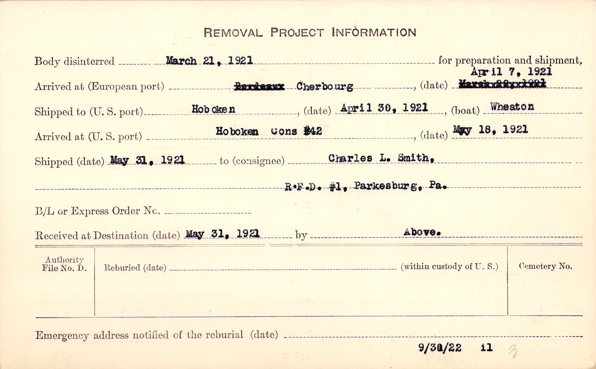 Body disinterred 3/21/1921 for preparation and shipment.