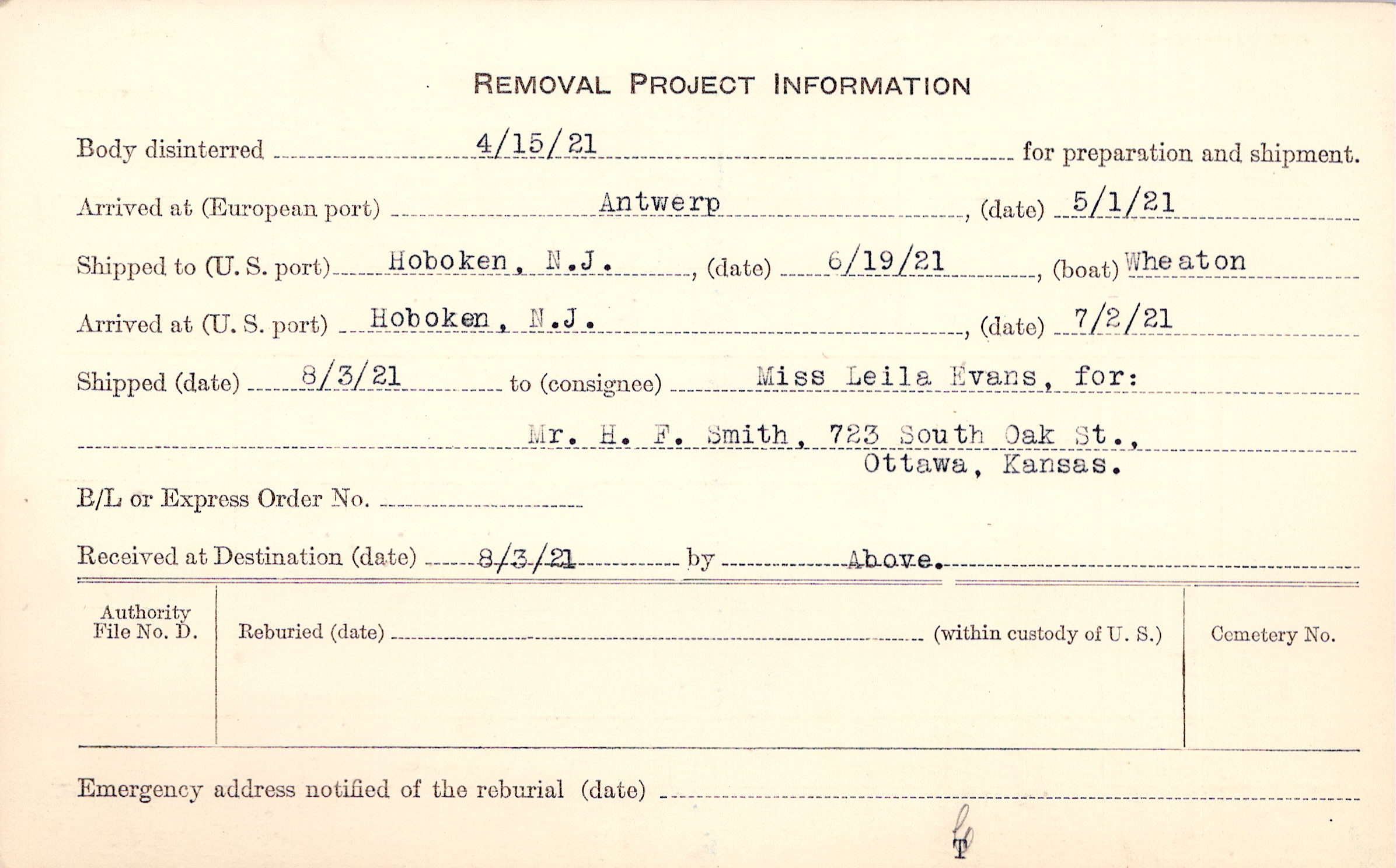 Body disinterred 4/15/1921 for preparation and shipment.