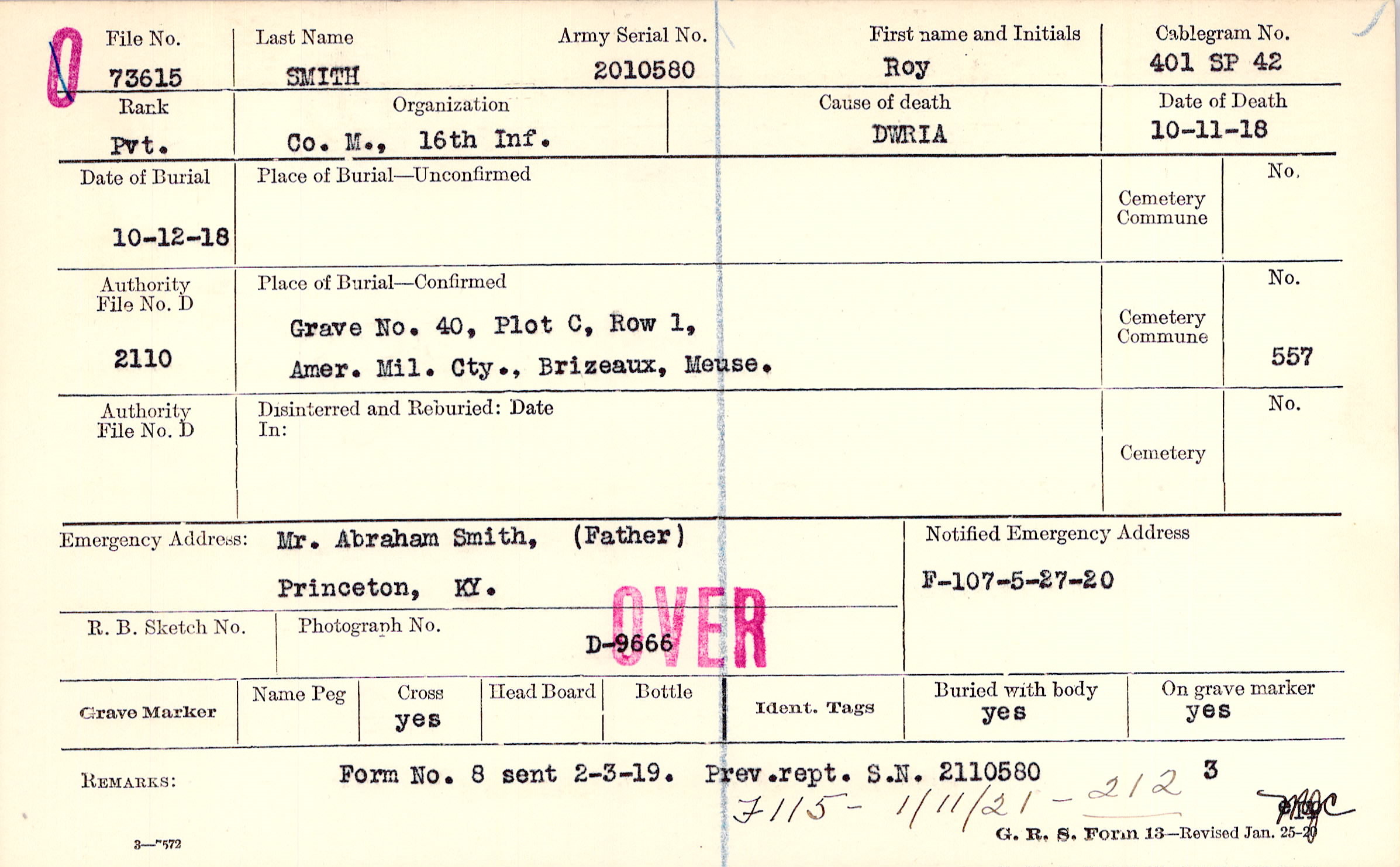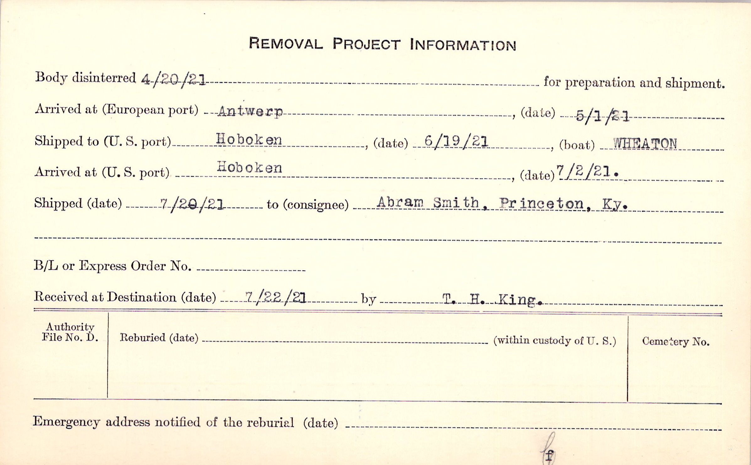 Body disinterred 4/20/1921 for preparation and shipment.