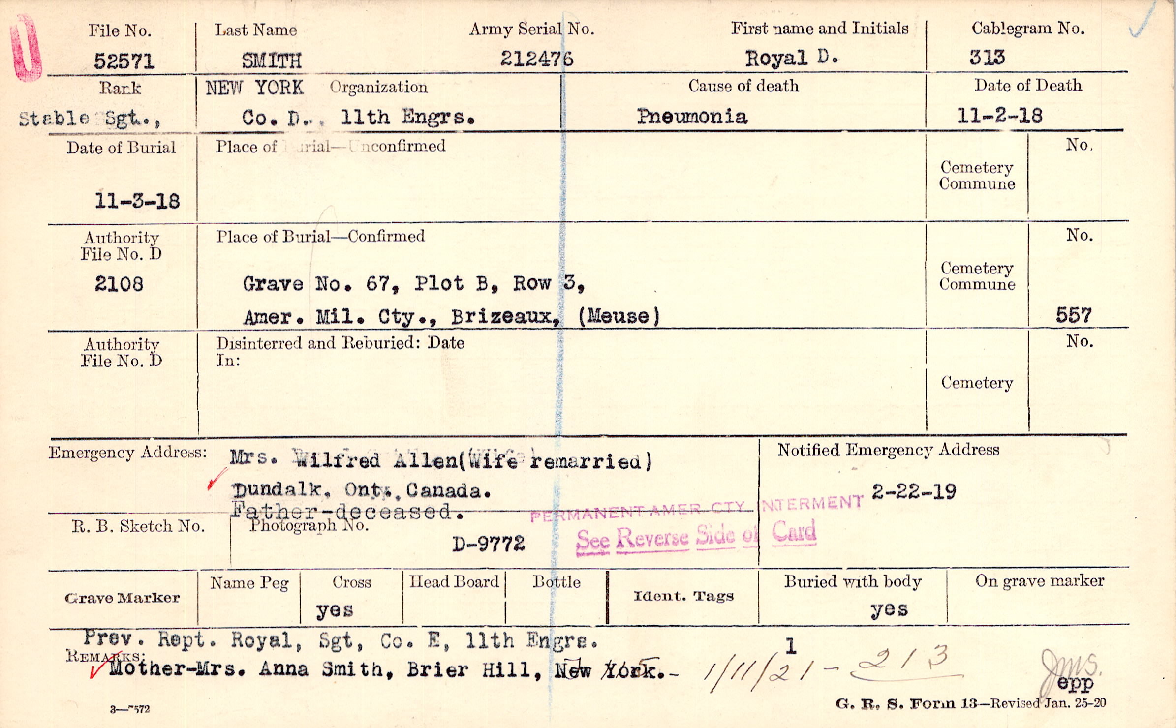 Prev. Rept. Royal, Sgt., Co. E, 11th Engrs. Mother-Mrs Anna Smith, Brier Hill, New York.-, F 115 - 1/11/21 - 213