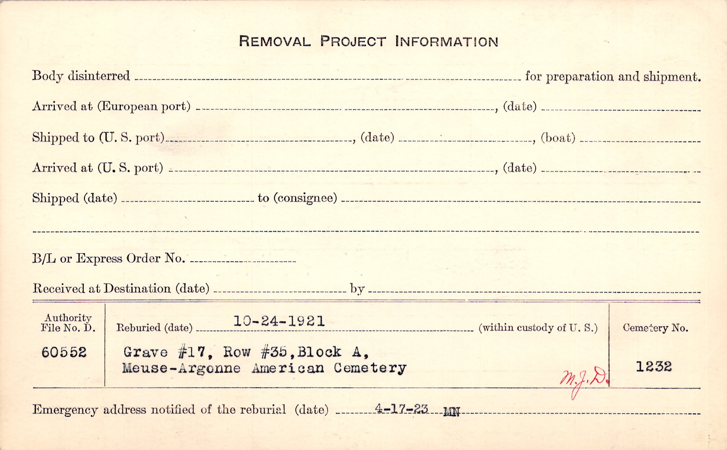 | Permanent Burial in Foreign Cemetery |
