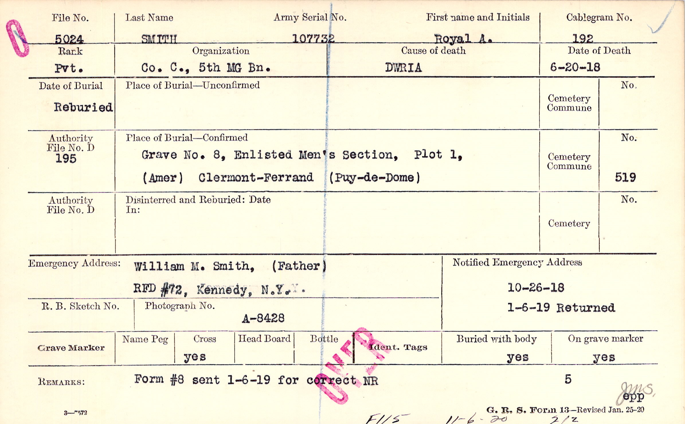 Grave 8, Enlisted Men's Section, Plot 1, (Amer) Clermont-Ferrand, Puy-de-Dome