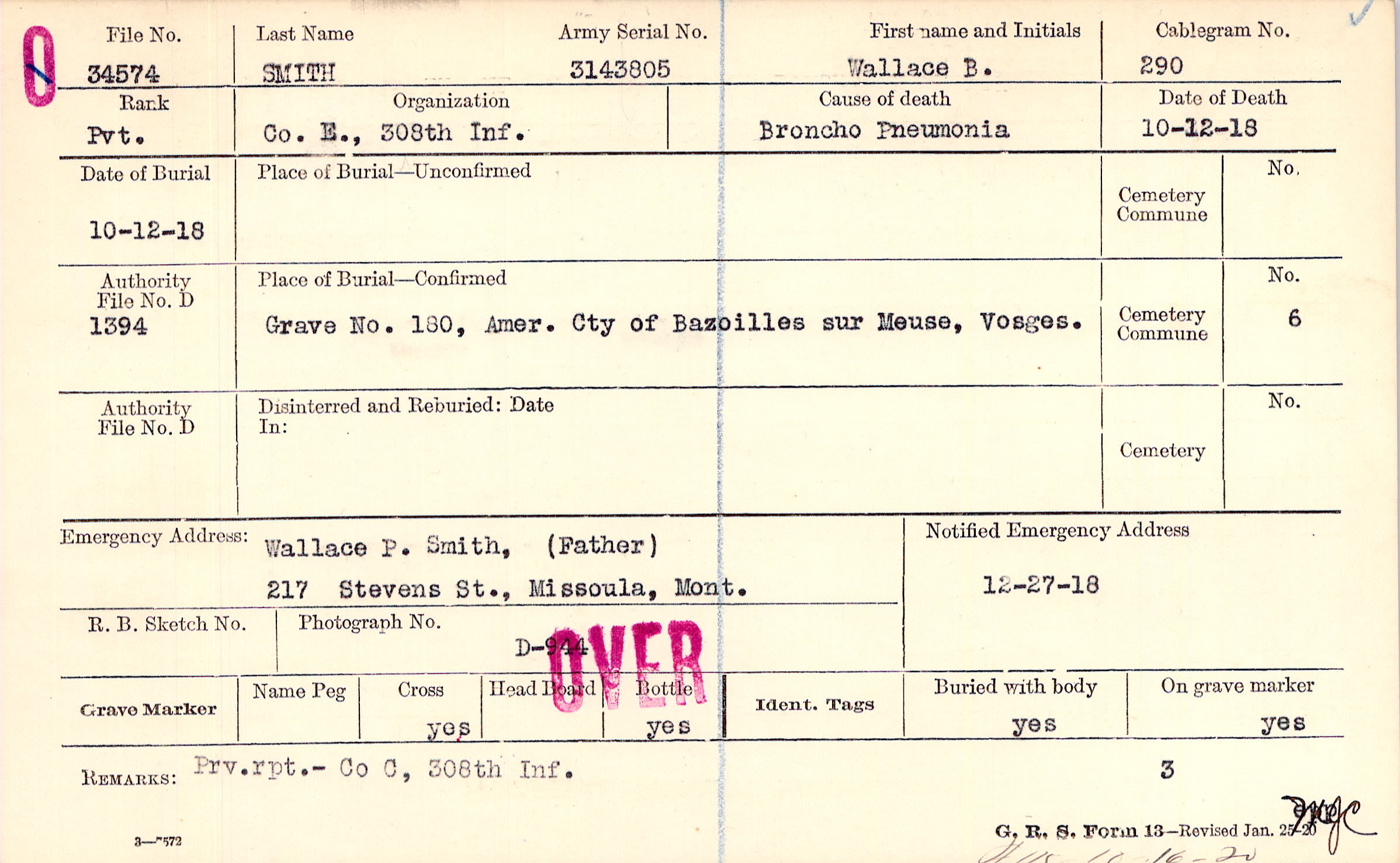 Wallace P. Smith, (Father), 217 Stevens St., Missoula, Mont.