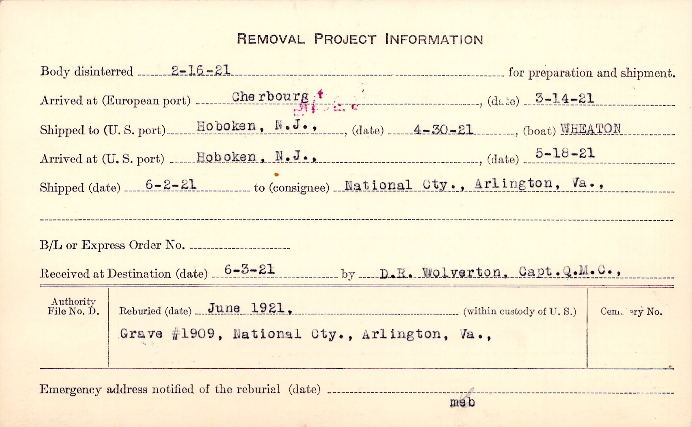 Body disinterred 2/16/1921 for preparation and shipment.