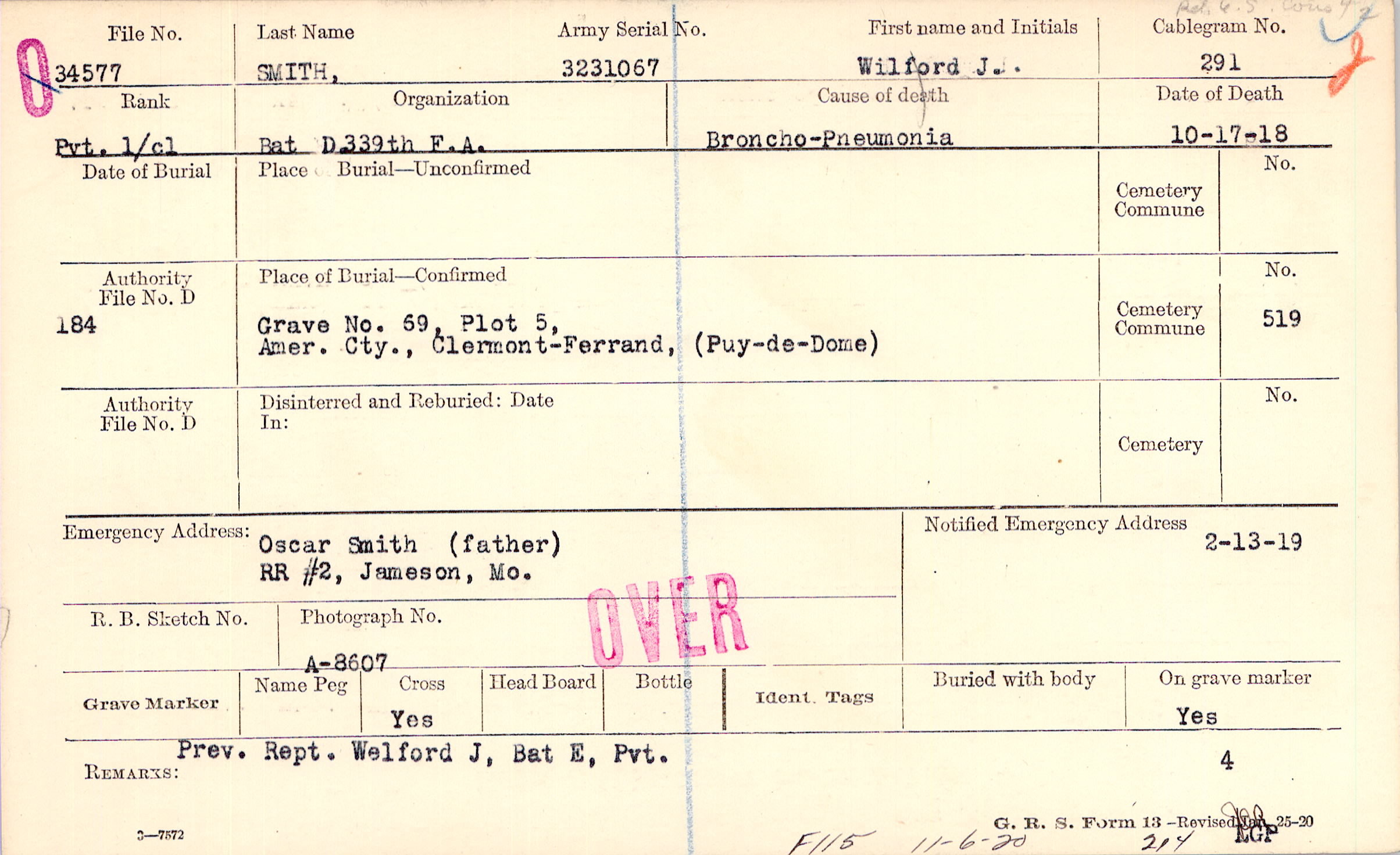 Grave 69, Plot 5, Amer. Cty., Clermont-Ferrand, (Puy-de-Dome)