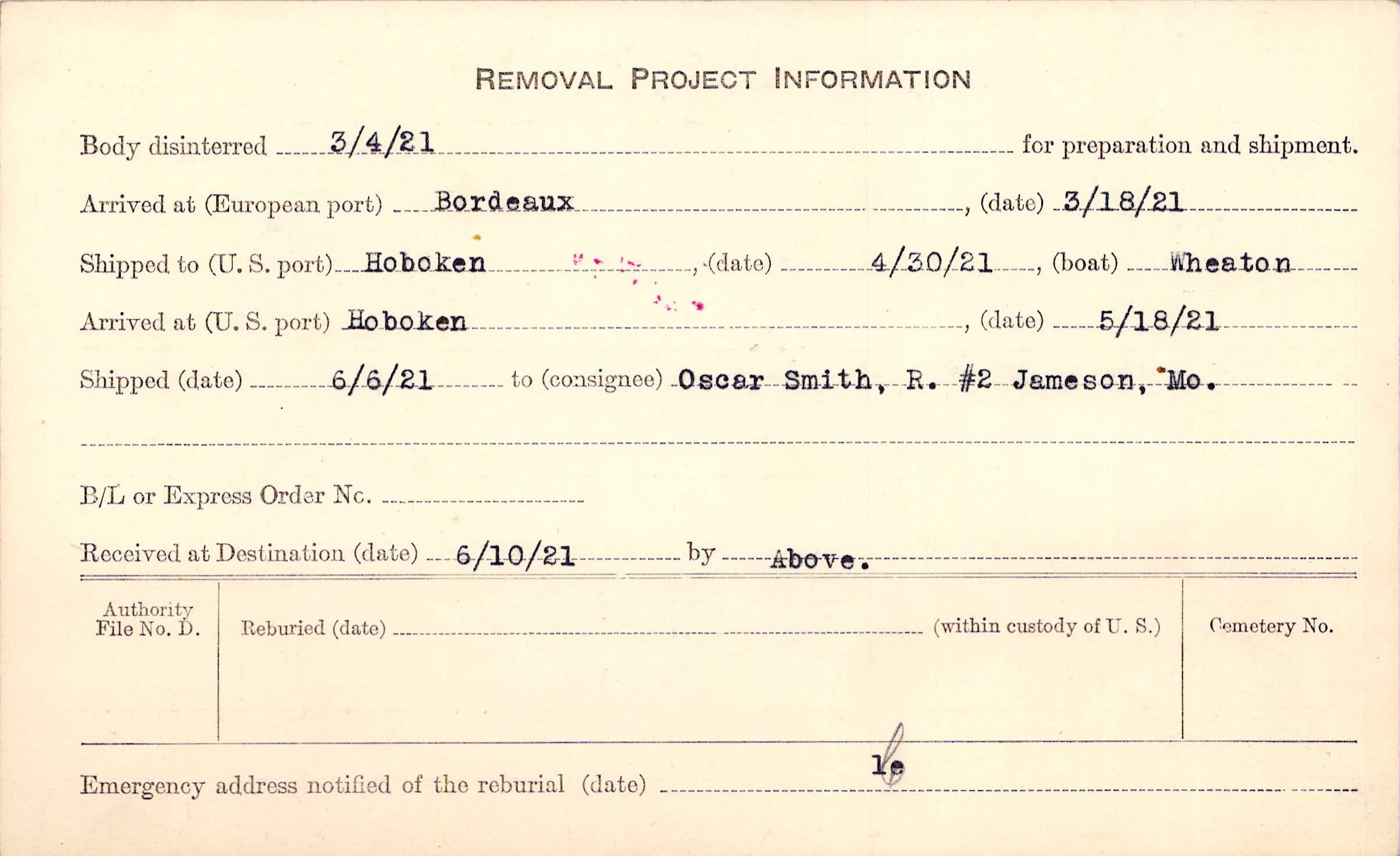 Body disinterred 3/4/1921 for preparation and shipment.